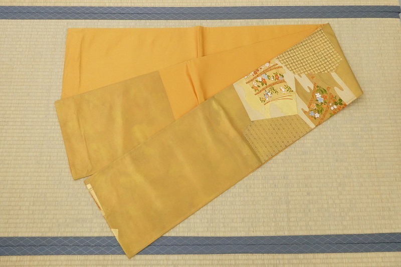 ◆袋帯/唐織/花柄等/リメイク・材料等に/お太鼓柄(ポイント柄)/新品/未仕立て/正絹/(梱包サイズ:80)◆* コメント・全体的に薄汚れ・薄い色ヤケがあり、一部ホツレがあります。 ・新品ですが、経年保存されていたお品ですので、ご理解のある方のご入札をお願い致します。 ・シミ、ヤケ等の難がある為、リメイク・材料・素材用としてのご利用をお薦めします。 ・ ・ * 品質・サイズ -- 着物サイズ目安 -- ・幅・約30.5cm、長さ・約416cm ・渋い金色 ・ ・※一部商品のみのお取引はお断り致しております。入札前・落札後に一部の商品のみのお取引交渉や発送方法(メール便等利用)の交渉はご遠慮下さい。サイズ・発送詳細を必ずご確認のうえ、ご理解・ご納得のうえでのご入札をお願い致します。 ・梱包サイズ:80サイズ(発送詳細必読) * 程度 当社基準ランク・・・【5】