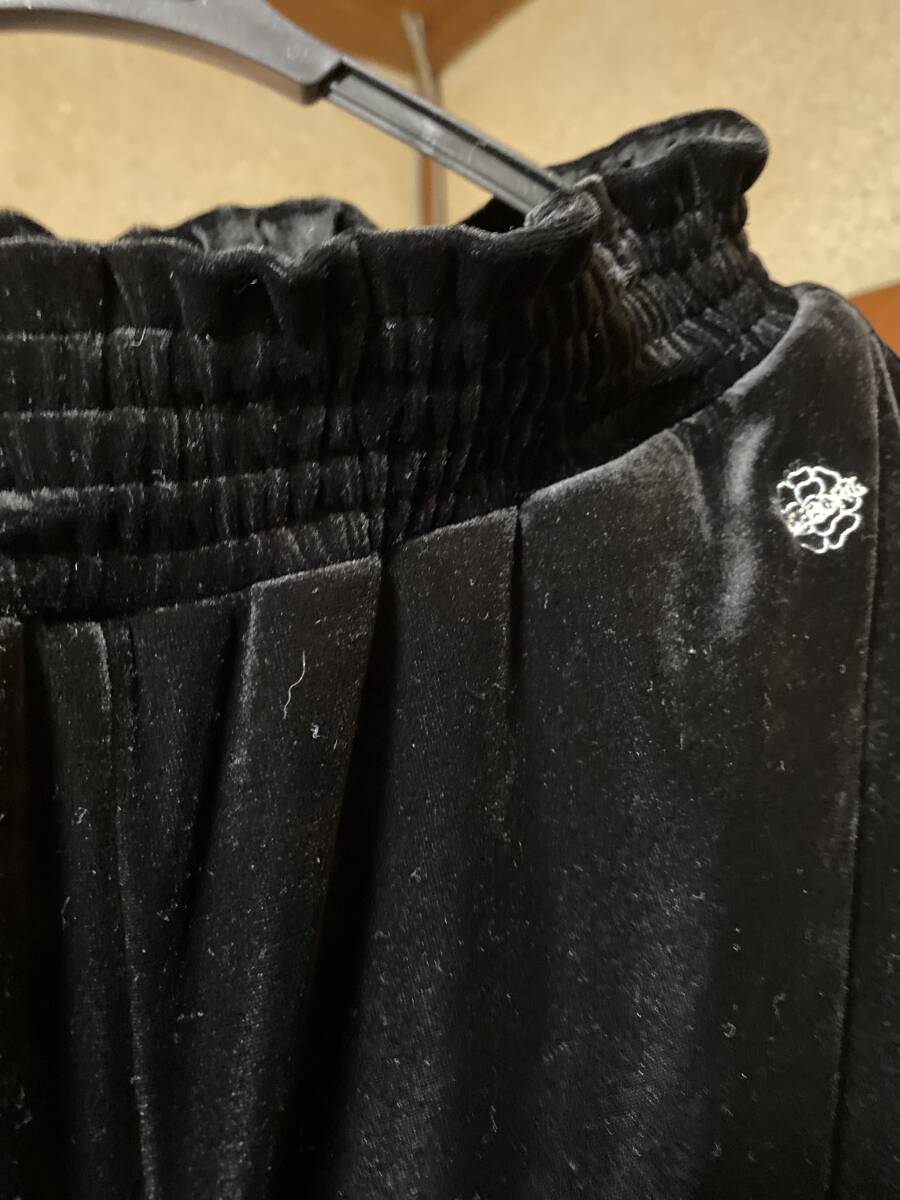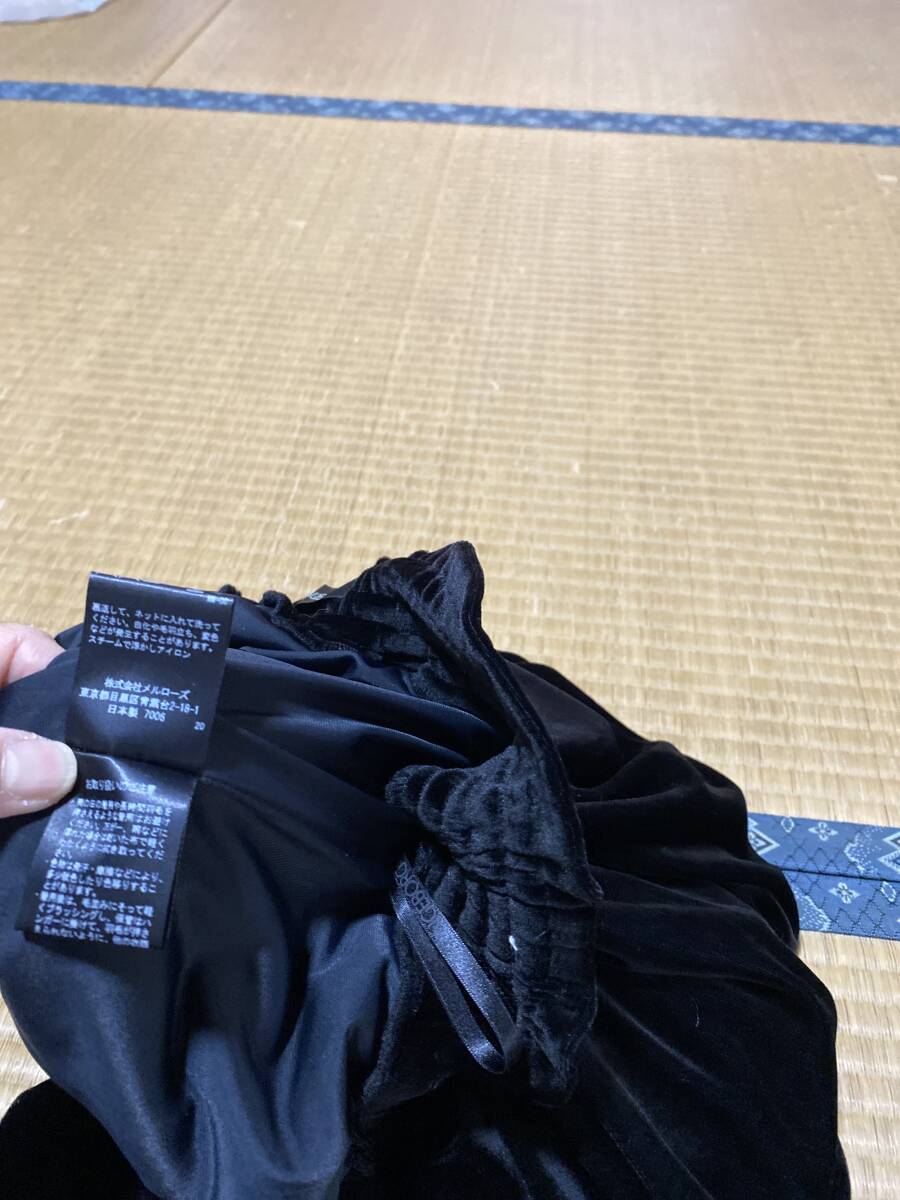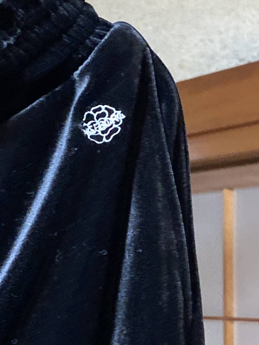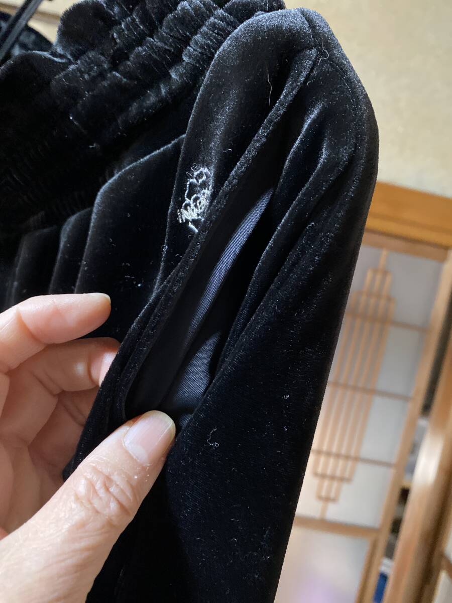 メルローズ製品、黒、柔らかいベロア、Freeサイズ、裏地付き、カメリア刺繍入り.左右ポケット付き