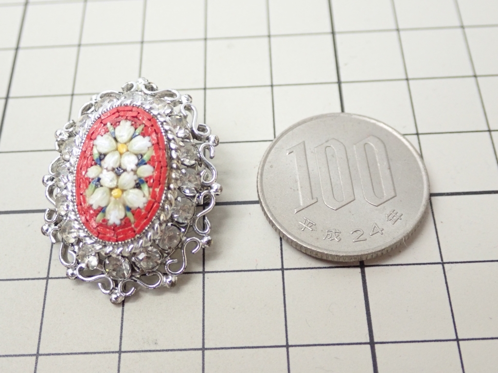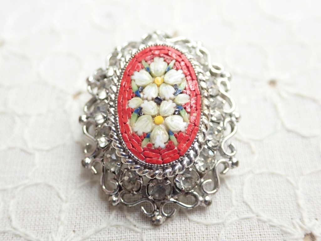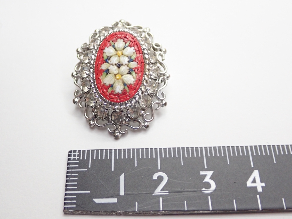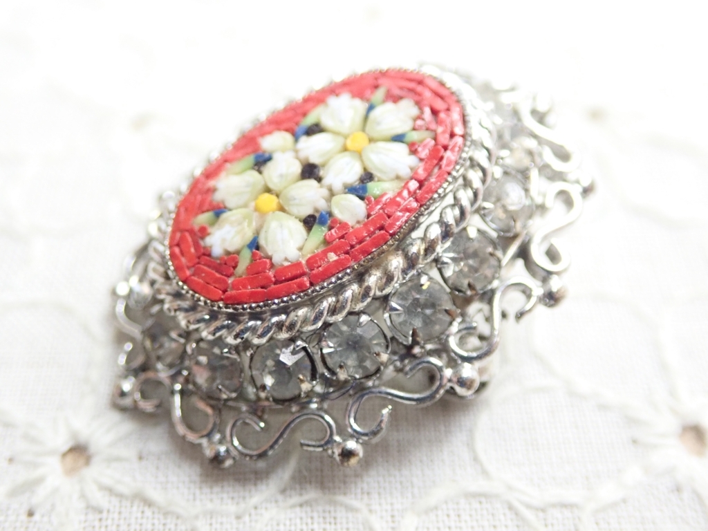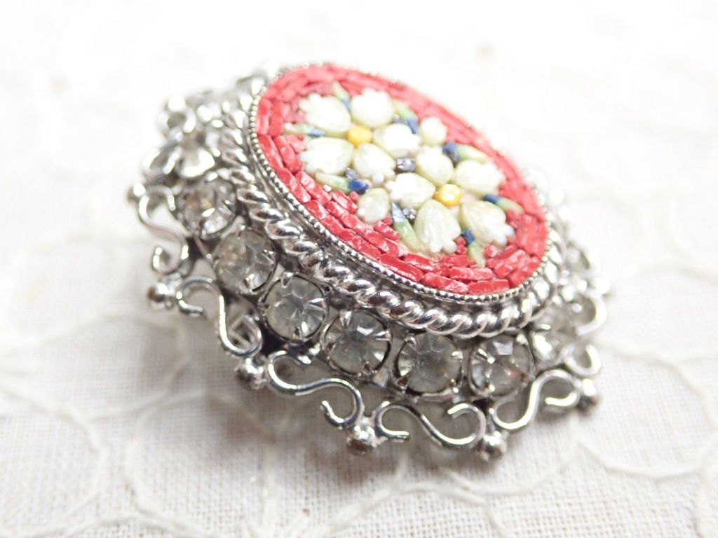 L514 ヴィンテージ ブローチ マイクロモザイク フラワーデザイン ラインストーン 小サイズ トップ アクセサリー Vintage brooch