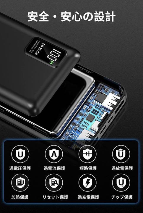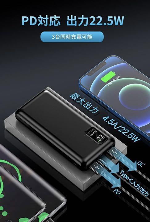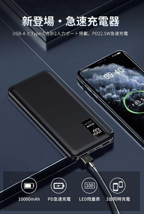 【PD22.5W対応&QC3.0急速充電】Power DeliveryとQuick Charge 3.0充電技術を採用しています。充電はUSB-CポートまたはUSB-Aポートからお使いの機器に最大出力22.5Wで可能です。PD対応のため、iPhone 12シリーズを最速で充電可能です。一般的な5W出力の充電器に比べ、最大3倍速く充電することができるモバイルバッテリーです。(iPhone12を0%から30分充電した場合との比較)【薄型軽量&10000mAh大容量】10000mAh大容量を持っているのに軽量、薄型などコンパクトです。モバイルバッテリーは手のひらのサイズでカバンに入れても負担になりません。10000mAhの大容量モバイルバッテリーでiPhone 12 / 12 Proに約2回、iPhone XS / Xに約3回、Galaxy S10に2回以上、iPad Pro (2018, 11インチ)に約1回、その他、ほとんどのスマートフォンを複数回充電が可能です。 旅行、出張、外出、通勤通学などでもバッテリー切れの心配がありません。【Type-C入力/出力対応&3台同時充電】モバイルバッテリーは高品質なリチウムポリマー電池を採用しています。3つ出力ポート(USB-A*2/Type-C)と2つ入力ポート(Micro-usb/Type-C)を搭載、3台までデバイスを同時に充電。接続されたデバイスを自動で認識するiSmart機能を搭載!自動的に最適な電流を調整可能、充電速度は30%アップ。デバイスごとに最適な電流を流すので、どんなデバイスでも急速に充電すること。【LCD残量表示&パススルー機能対応】LCD液晶ディスプレイが付きで、バッテリーの残量を1%単位で正確的に表示でき、電源の使用状況は一目瞭然で、充電のタイミングもより掴みやすくなります。充電が開始すると、緑色急速充電マークが現れています。パススルー機能搭載したバッテリーでスマホバッテリーに給電しつつ、モバイルバッテリー本体に充電できます。【安全保護システム&PSE認証済】安心の*PSEマーク付いています。技術基準の適合性が確認され、過電圧、過電流、過熱、および回路のショートを防げ、急速&安全な充電を提供できます。携帯充電器は飛行機に持ち込み可能です。ご自宅、海外旅行・出張でも安心してご利用いただけます。