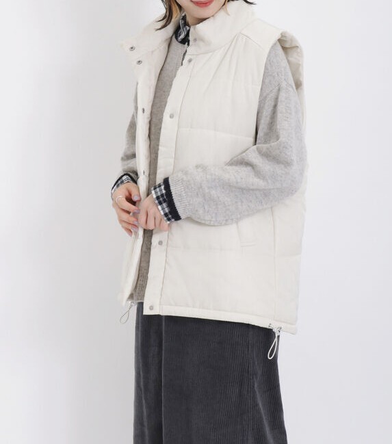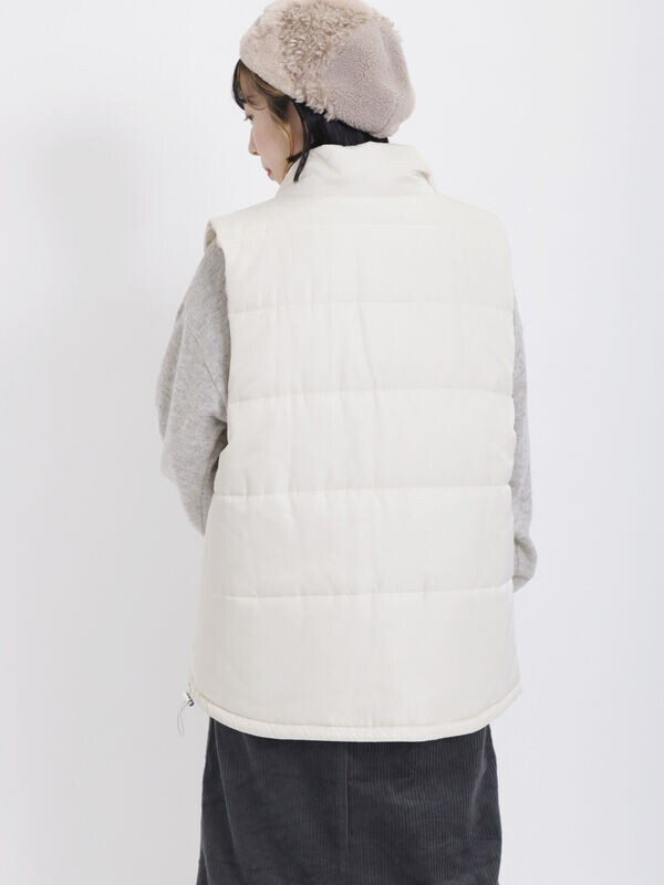 首元までカバーするスタンドネックデザインのベスト。