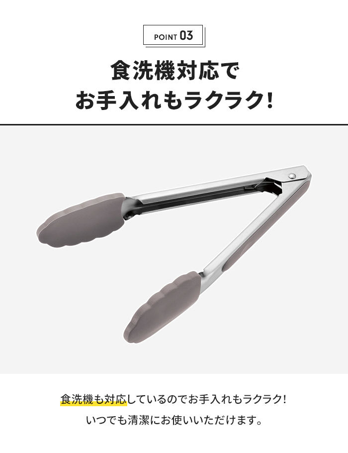 | ・片手で簡単に開閉できるから、キッチンでも卓上でも作業性抜群! ・先端部はシリコン製なので、お皿やお鍋をキズつけにくい。 ・食洗機OK! |