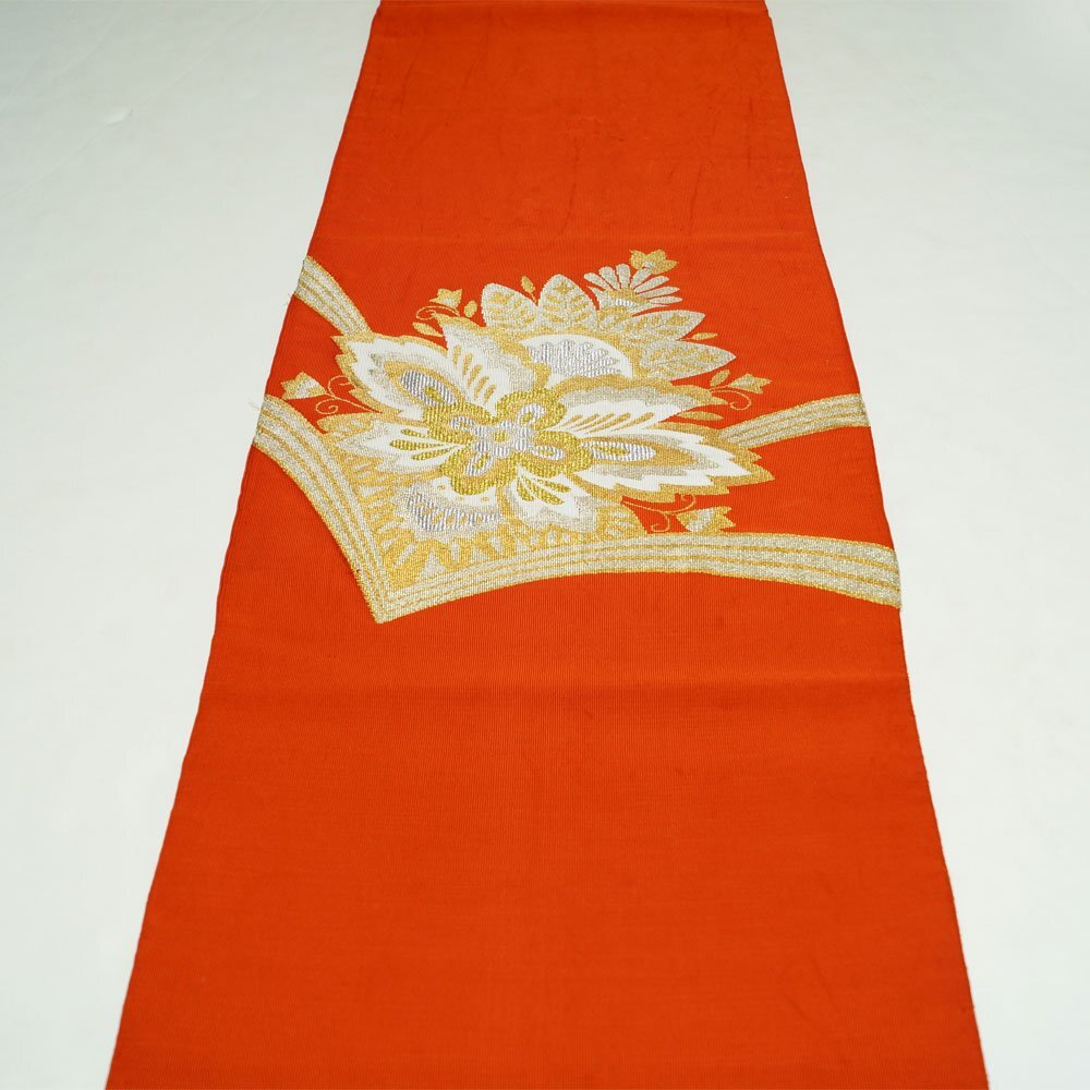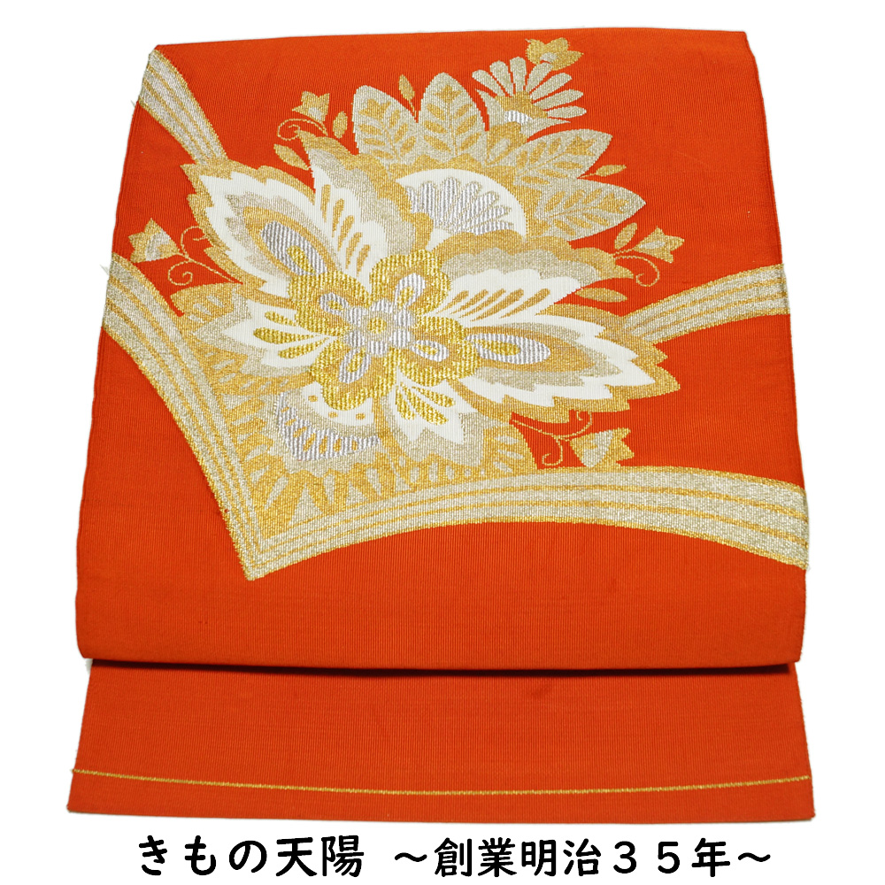 | 商品 説明 | 赤丹色系の綴れ地に唐花模様が織られた八寸名古屋帯です。 お太鼓部と前帯部だけ少し幅が広いです。 |