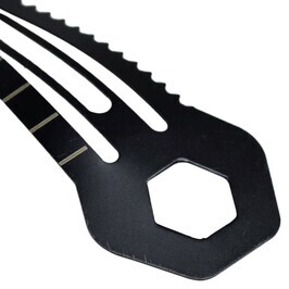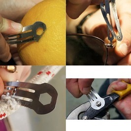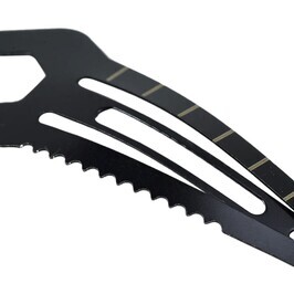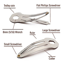 ヘアピンの形状に5つの機能を搭載(8mmレンチ、マイナスドライバー、定規、ノコギリ、カッター(トロリーコイン))。
