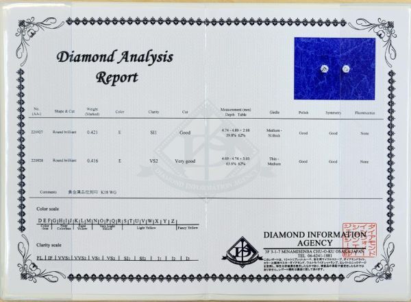 天然ダイヤモンド:0.421ct E-SI1-Good / 0.416ct E-VS2-Very good