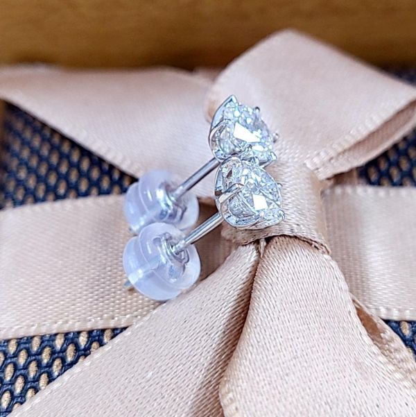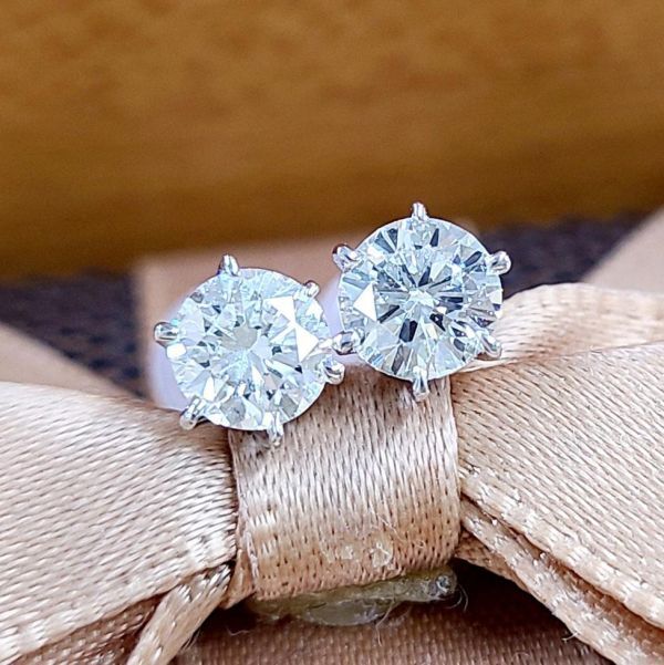 左右合わせて0.8ctのダイヤモンドは、いずれも無色のEカラー、クラリティはSI1とVS2、カットはGoodとVery Goodという高品質なグレードです。透明度が高く、内包物も極めて少ないため、光を浴びるとまるで無数の星が瞬いているかのような、眩い輝きを放ちます。