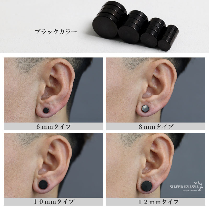 ピアスホールが無くても使えるマグネットピアス。耳に挟むだけで装着できます。シンプルな丸型デザインで気軽にお洒落を楽しめる!ゴールド/シルバー/ブラックの3カラー、6mm/8mm/10mm/12mmの4サイズから選べます。