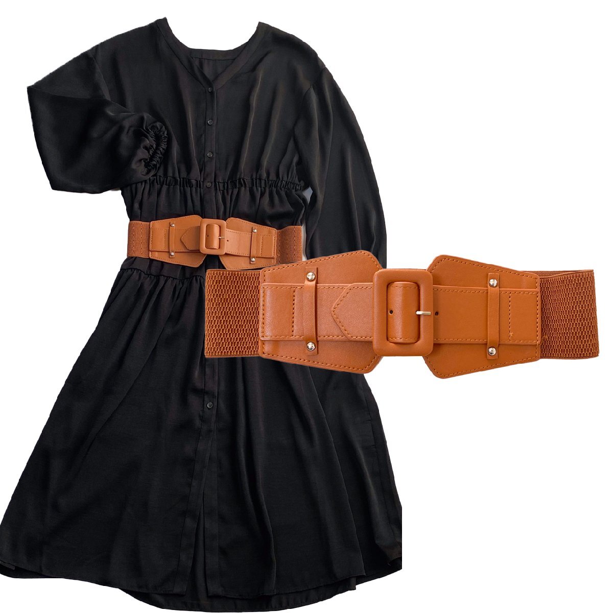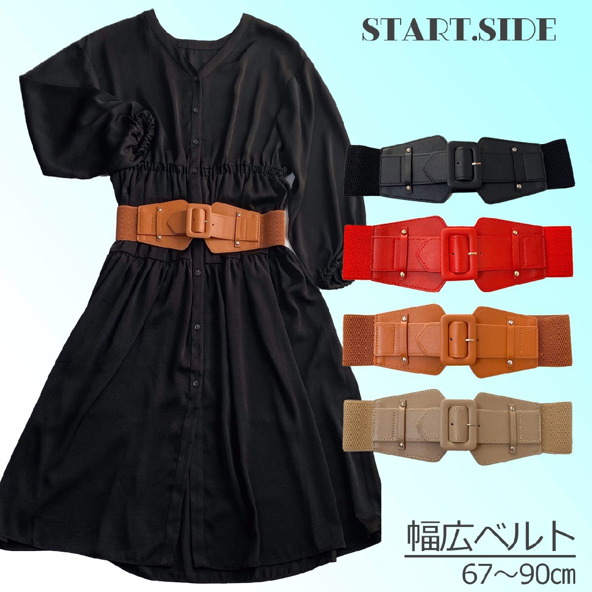 レディース ベルト ワンピース ゴムベルト 幅広 ウエスト 綺麗 絞り カジュアル ビジネス 太 バックルベルト 茶ブラウン