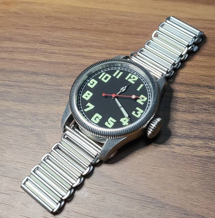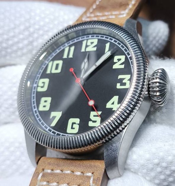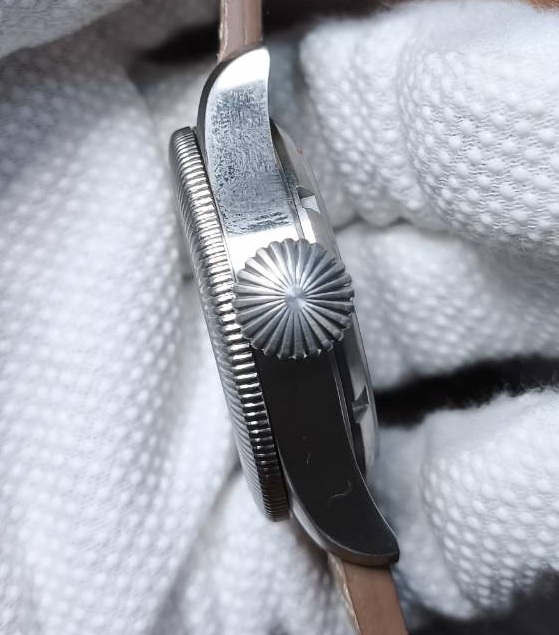 ビンテージ感のあるカーキ色の文字にコインエッジベゼル+大径龍頭
