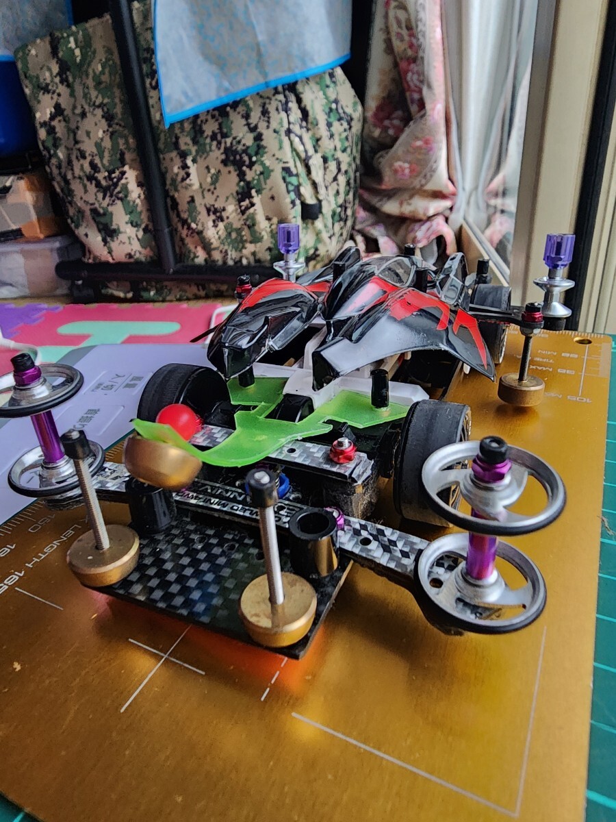 ○キャッチャーダンパーに置きマスダンパーで垂直落下でも1回で収まります。リアのマスダンパーを軽くすれば、加速はあがりますが、安定感が、落ちてしまいます。