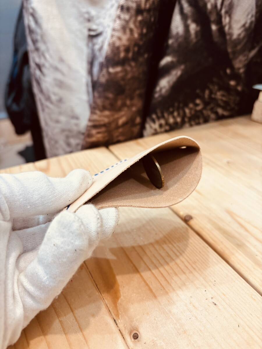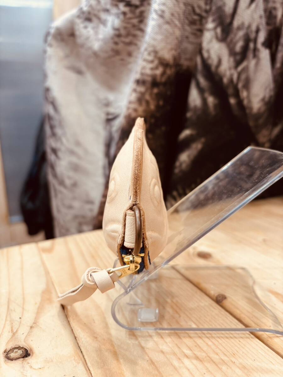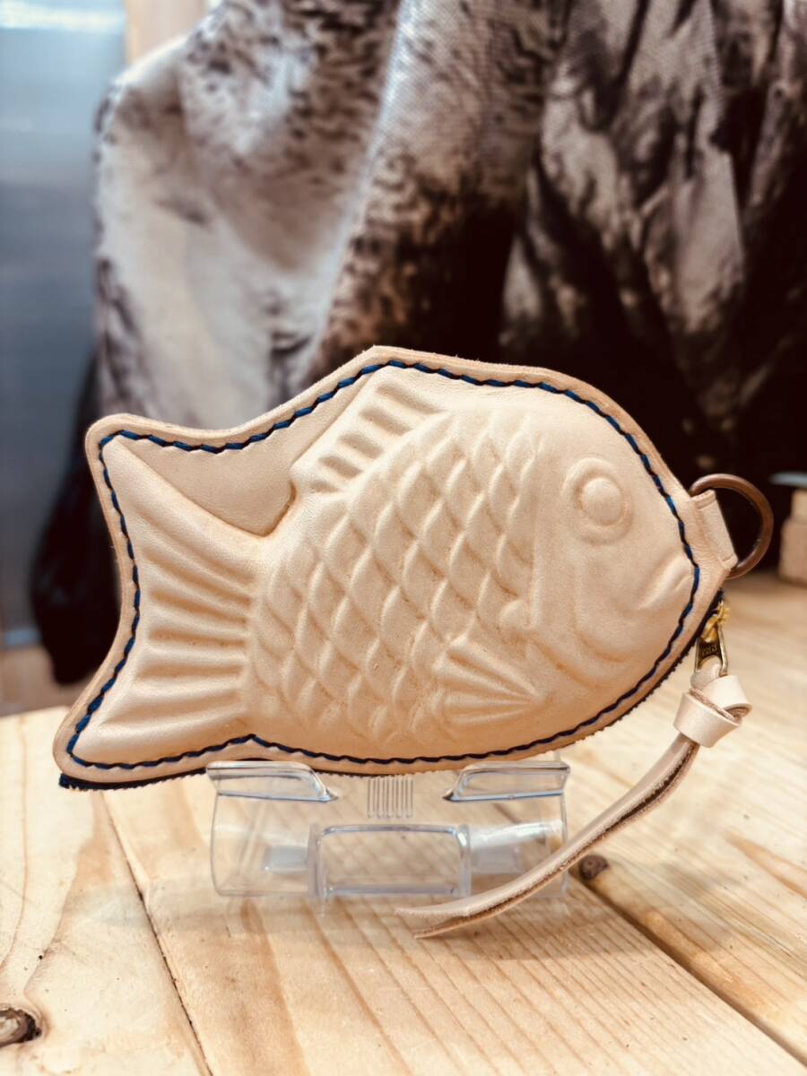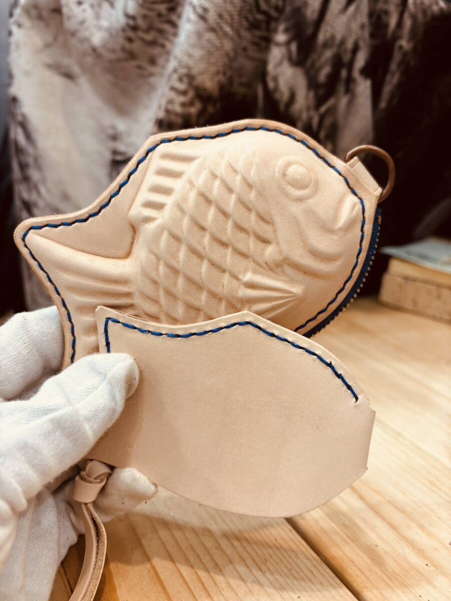 国産のヌメ革1.8mm厚を使用し、たい焼きの形を使用し一匹ずつハンドメイドにて作成いたしました。