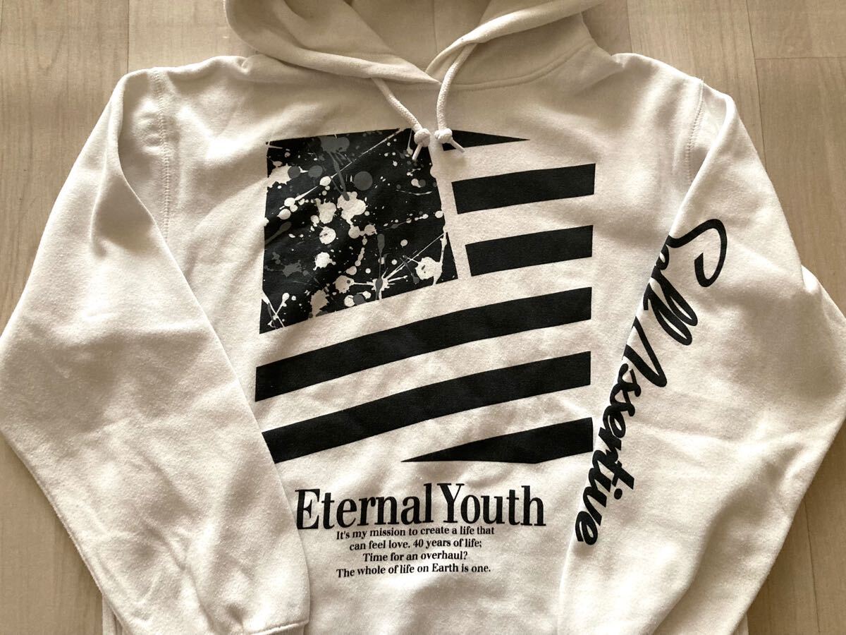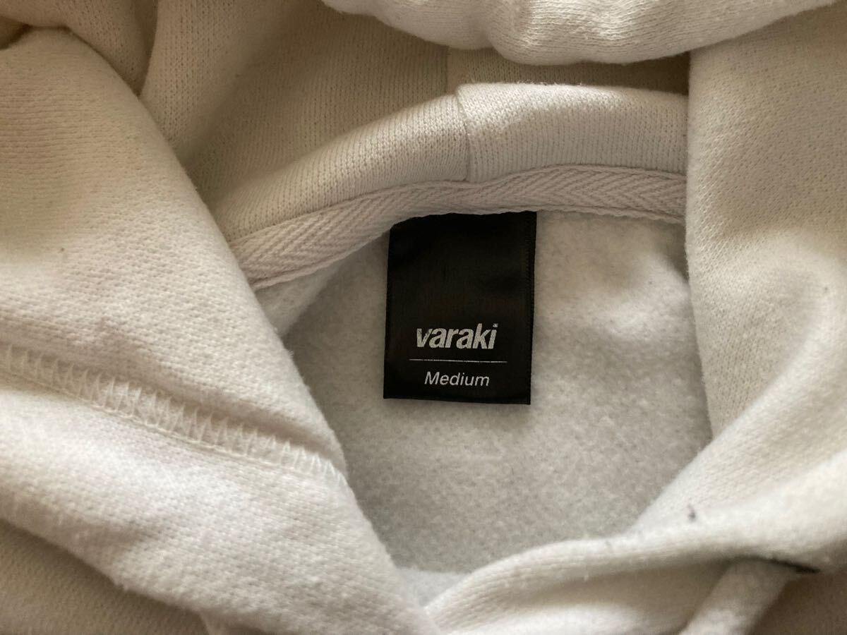VARAKI スプラッタープリントとストライプデザインのホワイトパーカー。