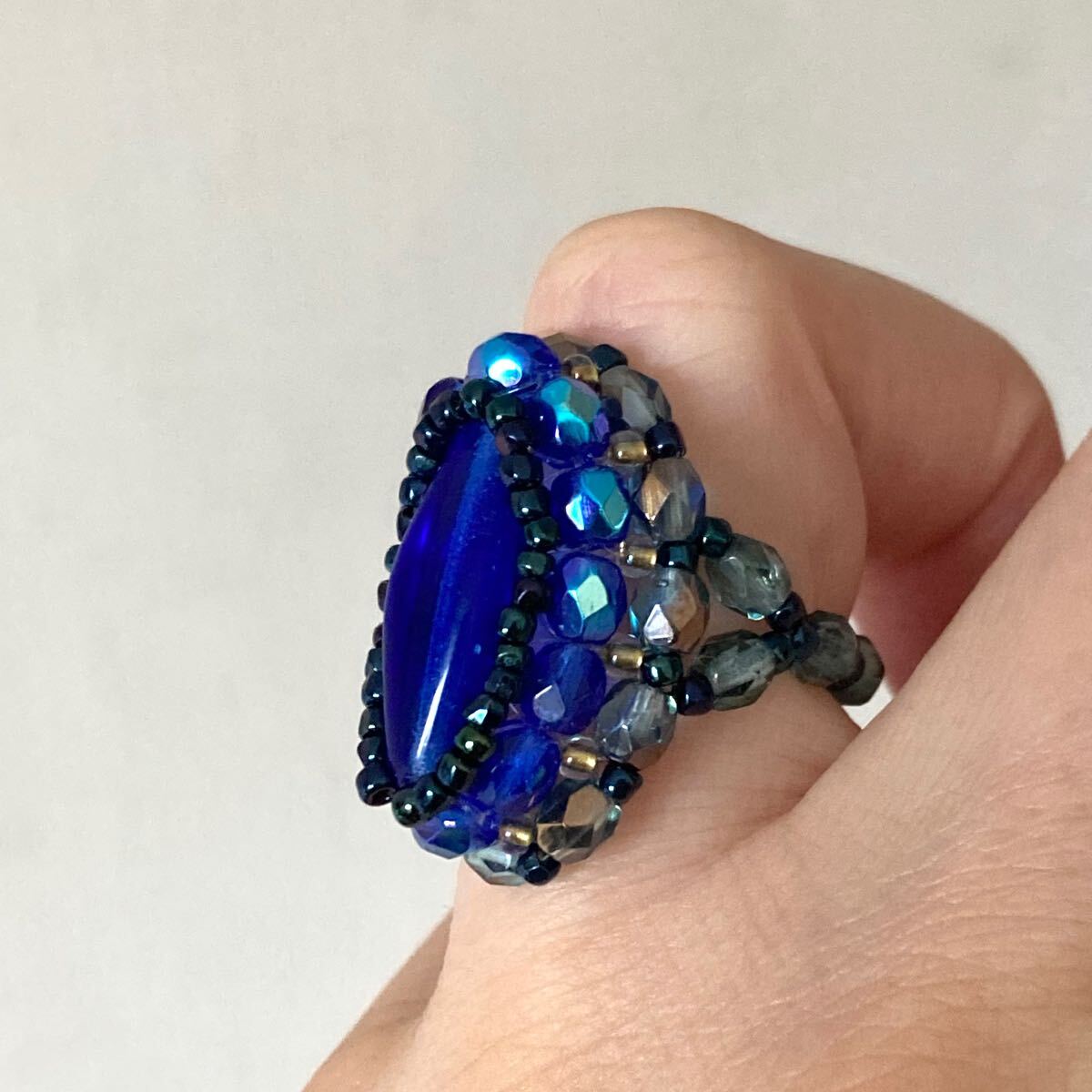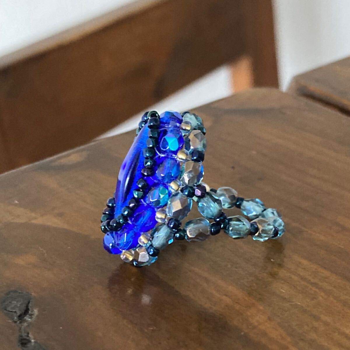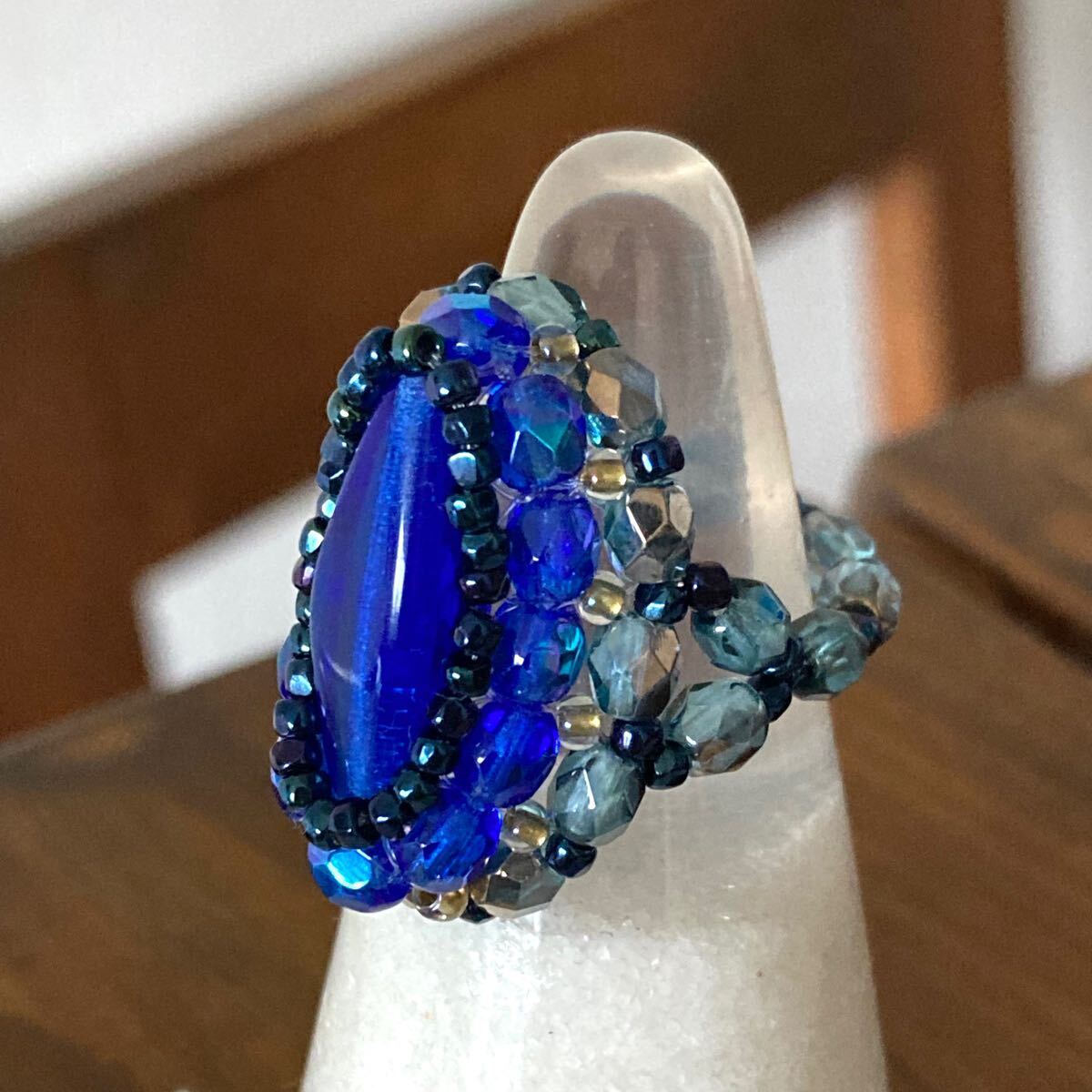 ブルーのロングバイコーンチェコビーズの周りをチェコビーズ、丸小ビーズで細かく3重に編んだデザインのリングです♪