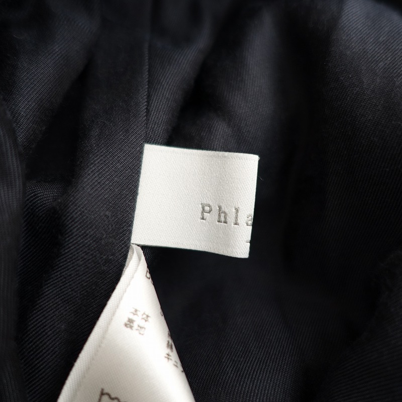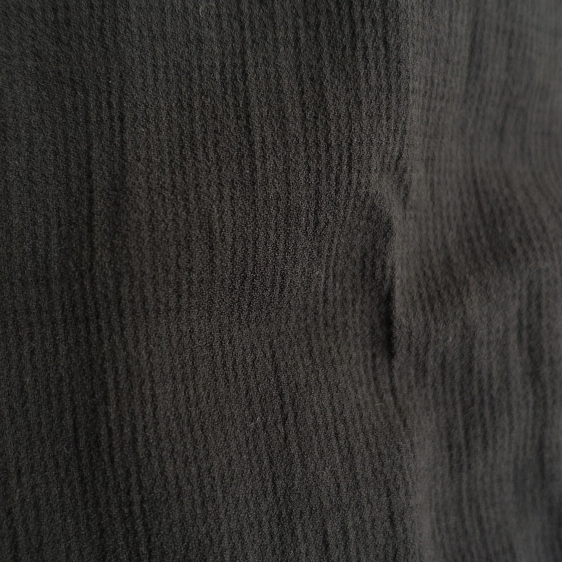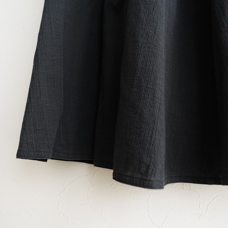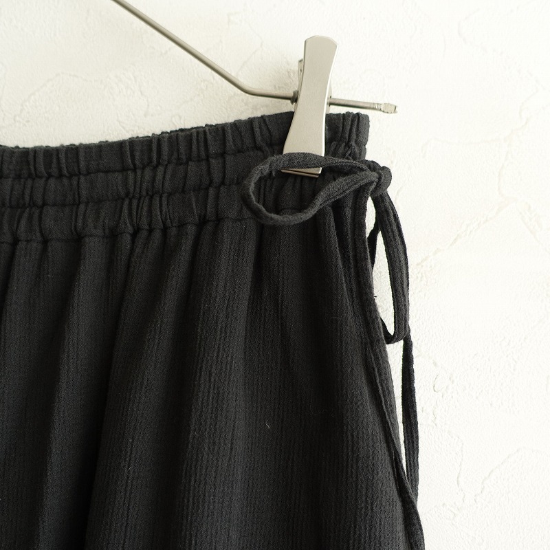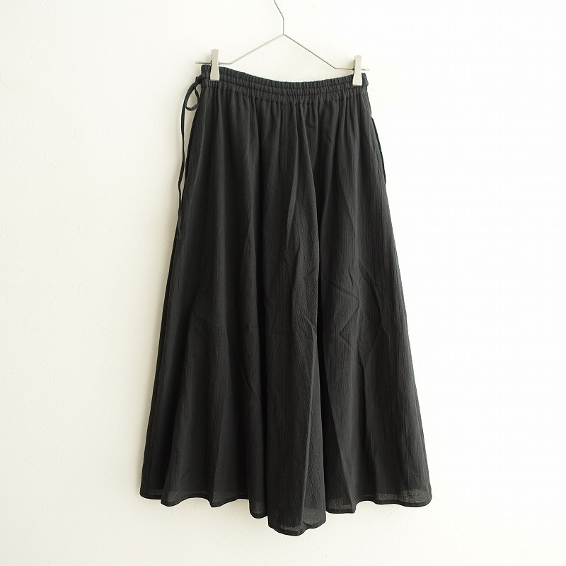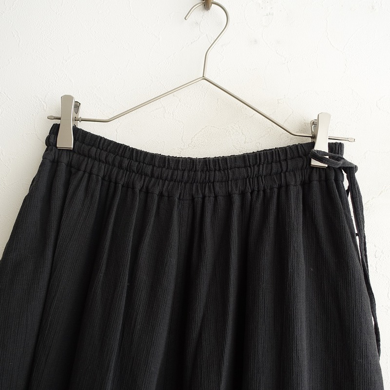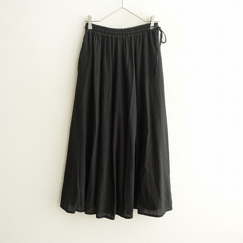 | Phlannelのコットンドローストリングギャザースカートです。カラーは墨黒で、シボ感のあるコットン地で仕立てられています。ウエストはゴム仕様に、ひもが通っており調整可能です。両サイドにポケット付きです。 |
