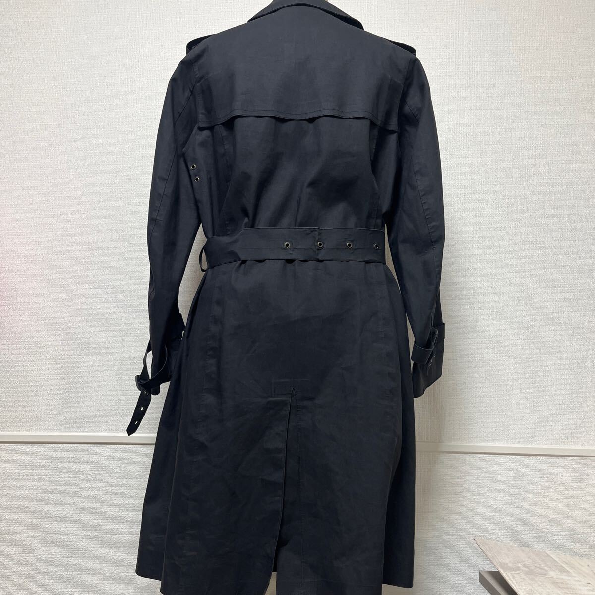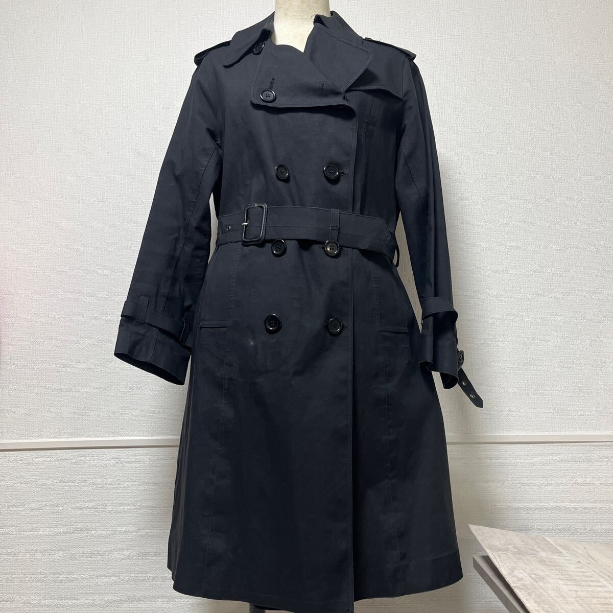 ブラックのダブルブレストトレンチコートでベルト付き。