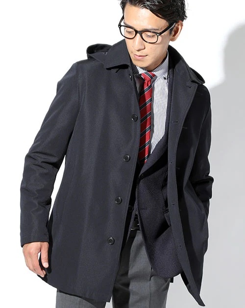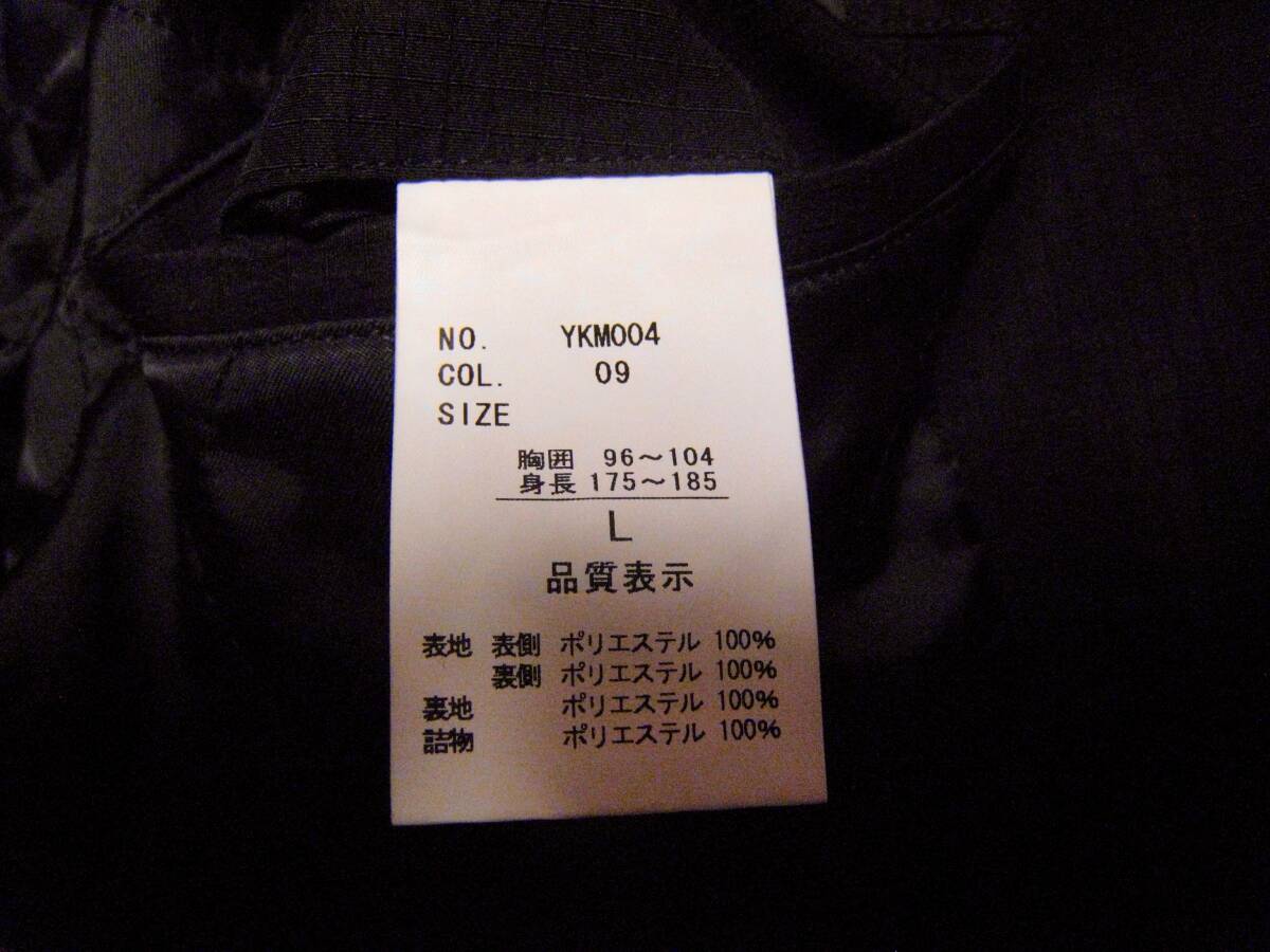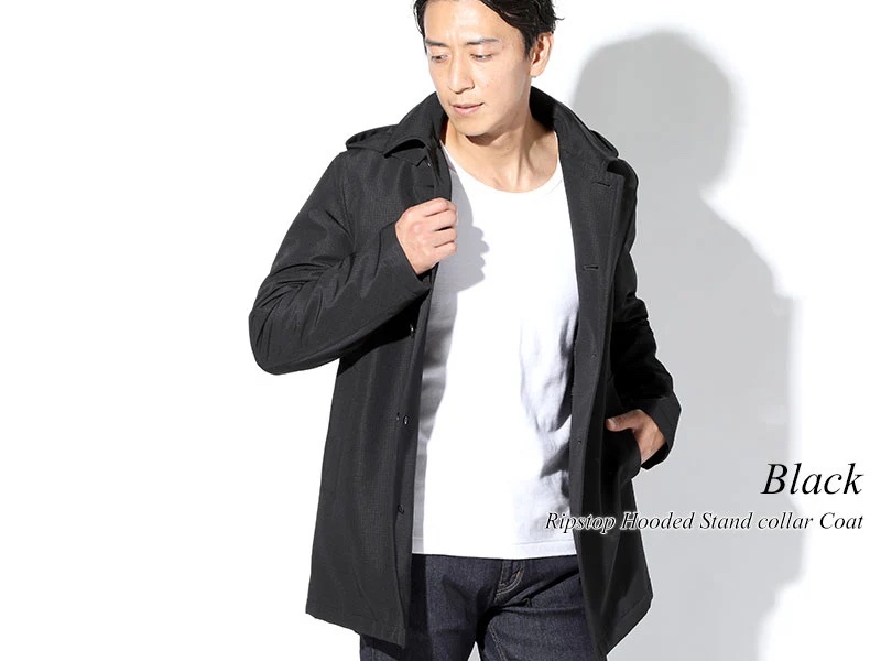 撥水リップストップフード付きステンカラーコートです。色はブラック、Lサイズ、実質1回使用のみ、美品です。定価は24000円程します。発送はヤマト宅急便120サイズでお願いします。