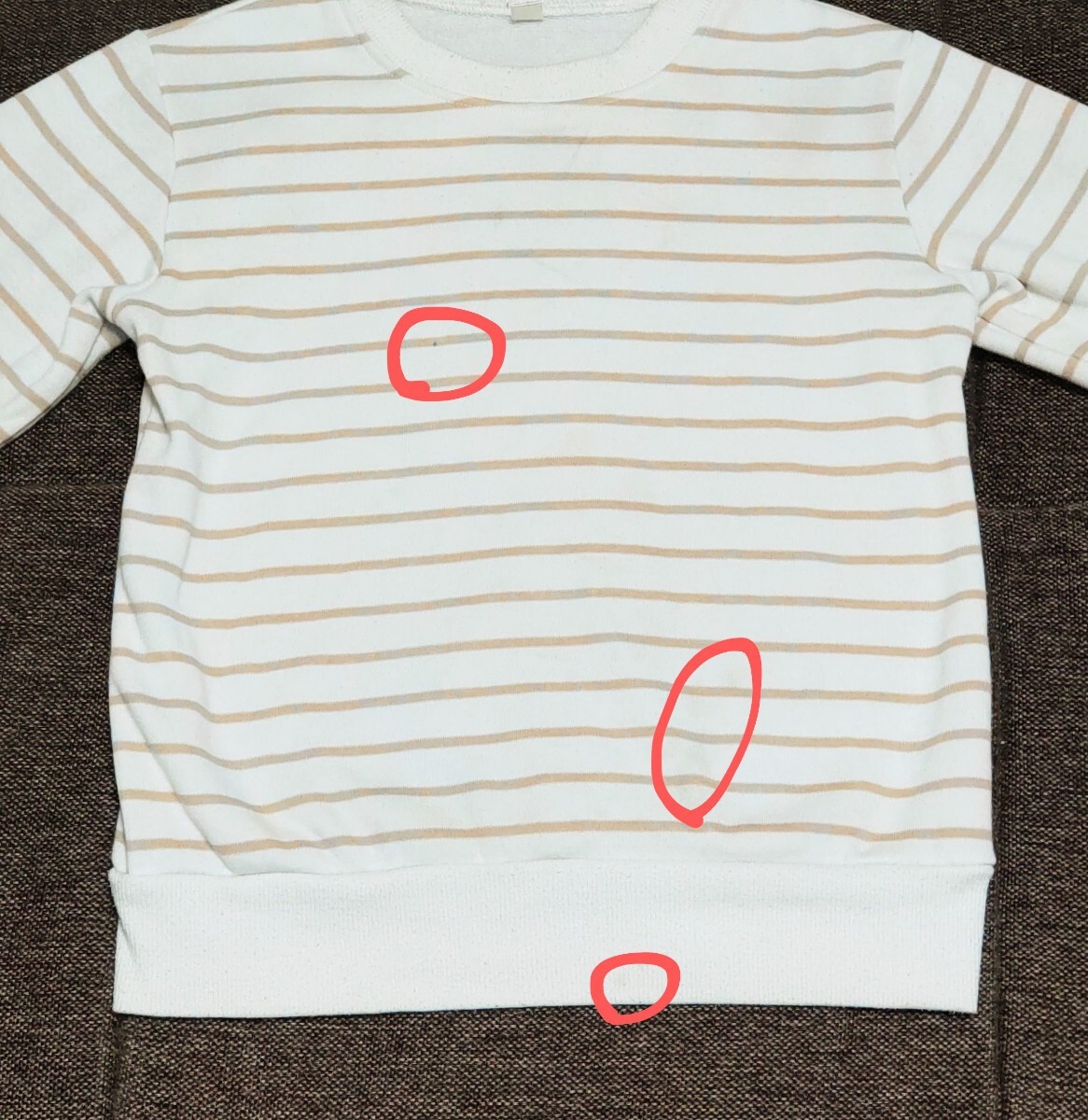 ・着用12 回、真ん中近くに小さな緑っぽいペン痕、下の方に薄いシミがあります。それ以外に極薄いシミもありますが酷くはないと思いますし、まだまだ着れます。