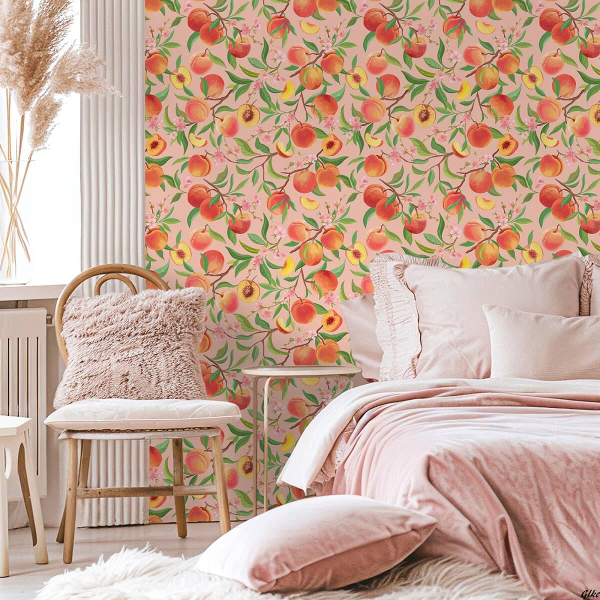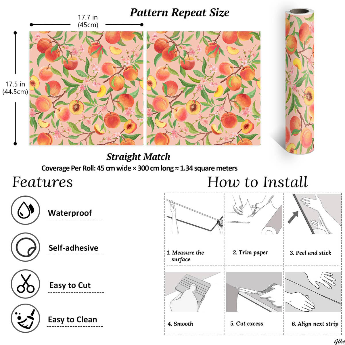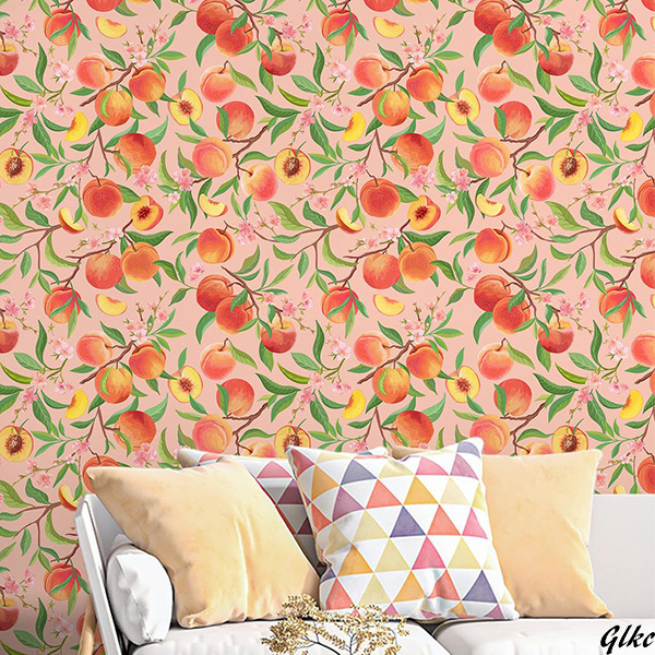【熟した桃の赤い色と、緑の葉・ピンクの花が活力を与える】壁紙シール 幅44.5cm×長300cm 多用途 PVC素材 おしゃれ