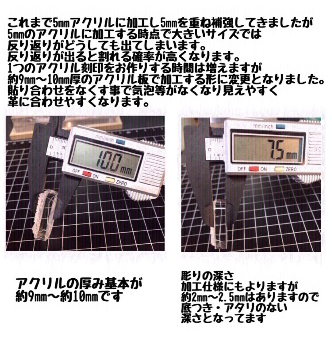 これまで同様、にゃがクラフト工房様より教えていただいたレーザー加工にて当方作製のアクリル刻印も販売致します。