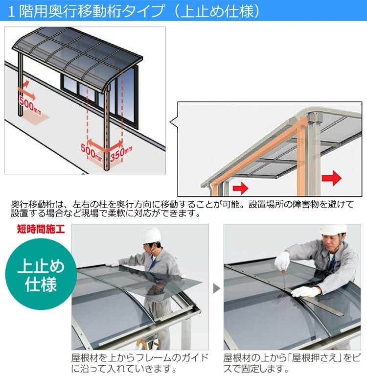特徴 | 奥行移動桁タイプ 施工方法:屋根材 上止め仕様 |