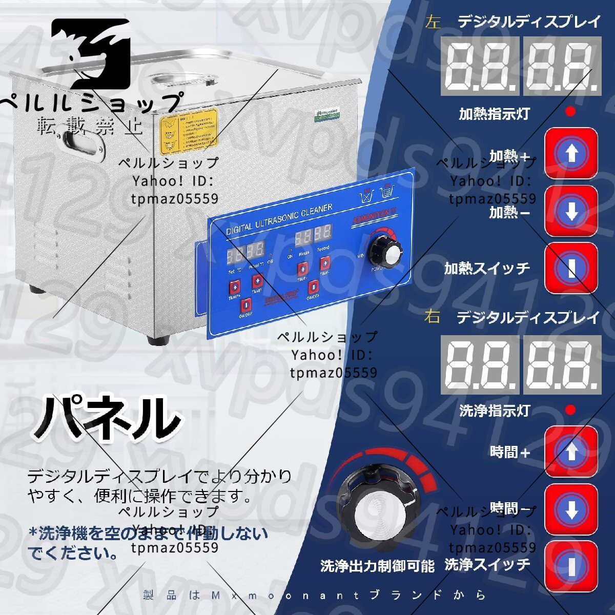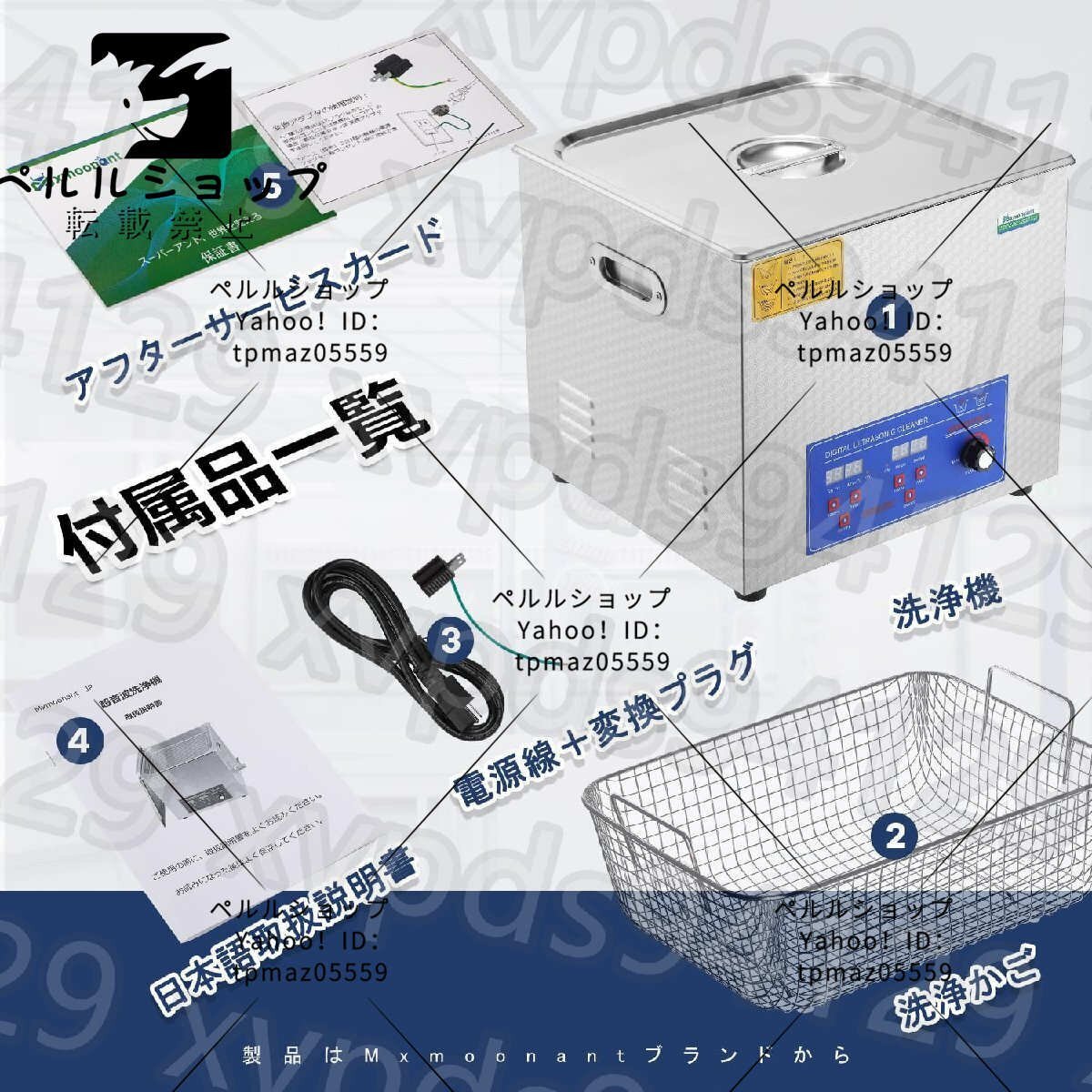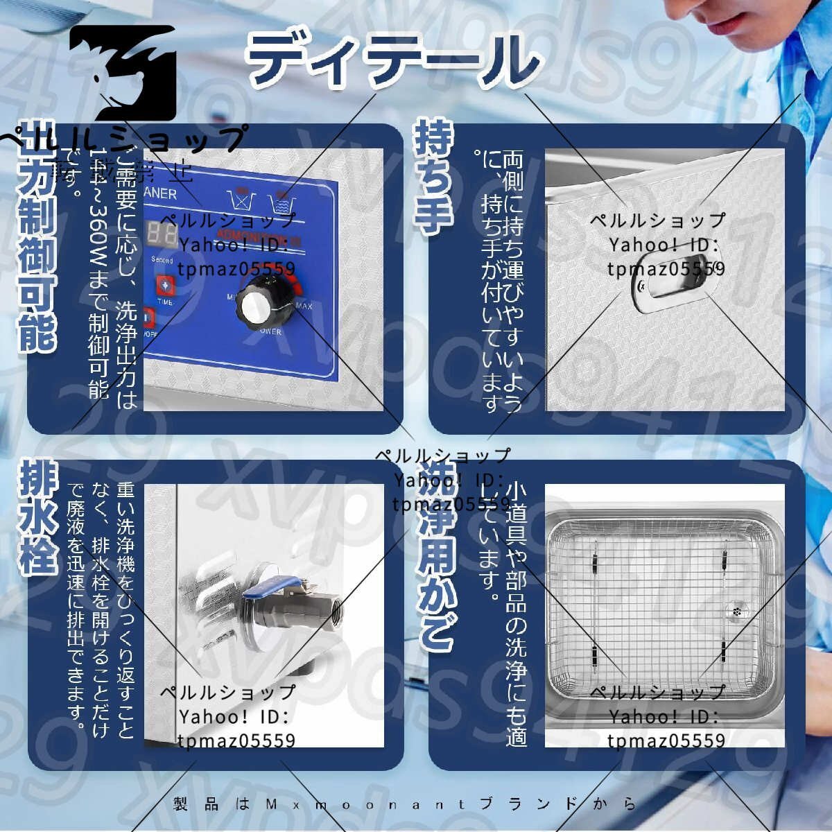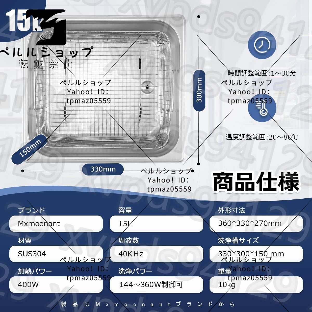【商品説明】 1.水道水で洗浄することがOK、適当な洗剤を使うと努力は半分で洗浄効果は倍です。【商品仕様】: ■ブランド:Mxmoonant ■容量:15L ■振動子:6個 ■正味重量:8.6kg ■製品重量:10kg ■洗浄槽材質:SUS304 ■洗浄パワー:360W ■加熱パワー:400W ■パワー調節範囲:150-360W ■温度設定可能:常温-80℃ ■時間設定可能:0-30min ■周波数:40000? ■製品サイズ:360*330*270(L*W*H) ■洗浄槽サイズ:330*300*150mm(L*W*H) ■電圧:AC100-120V 50/60HZ