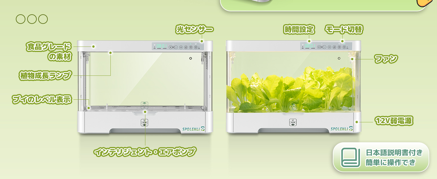 【細部について】現在時刻また植物成長ランプの時間は手動で設定可能です。(デフォルトの点灯時間:7:00-19:00)キッズロック付き、設定が恣意的に変更されるのを防ぐし、公共の場所に置く場合、他の人が誤って触れないようにします。ドア付き、野菜に自分のスペースを与えるし、部屋をもっときれいになります。
