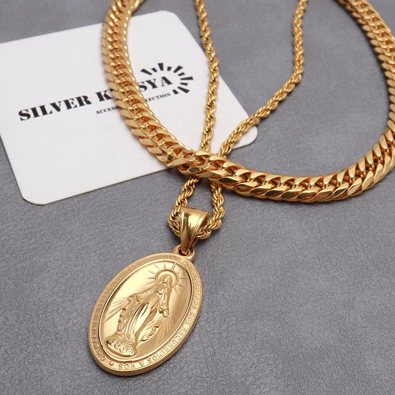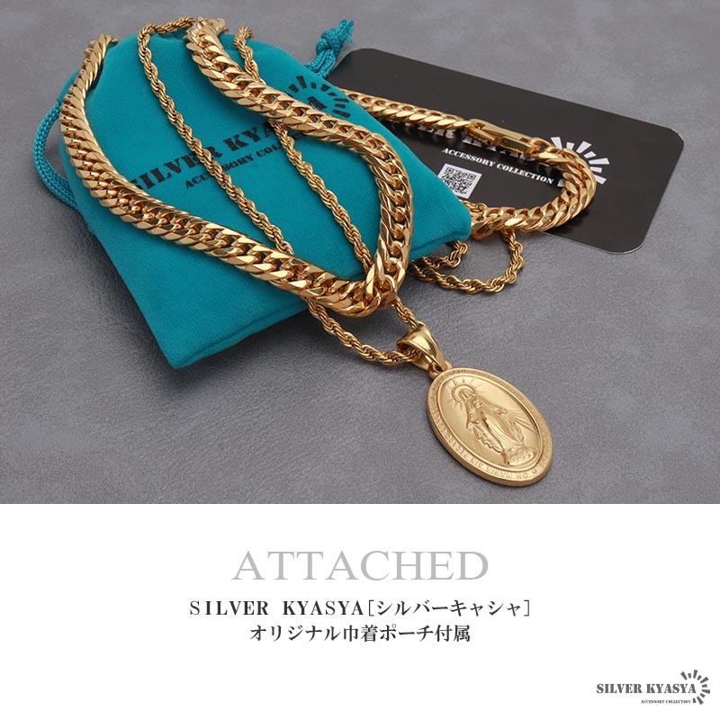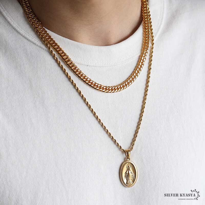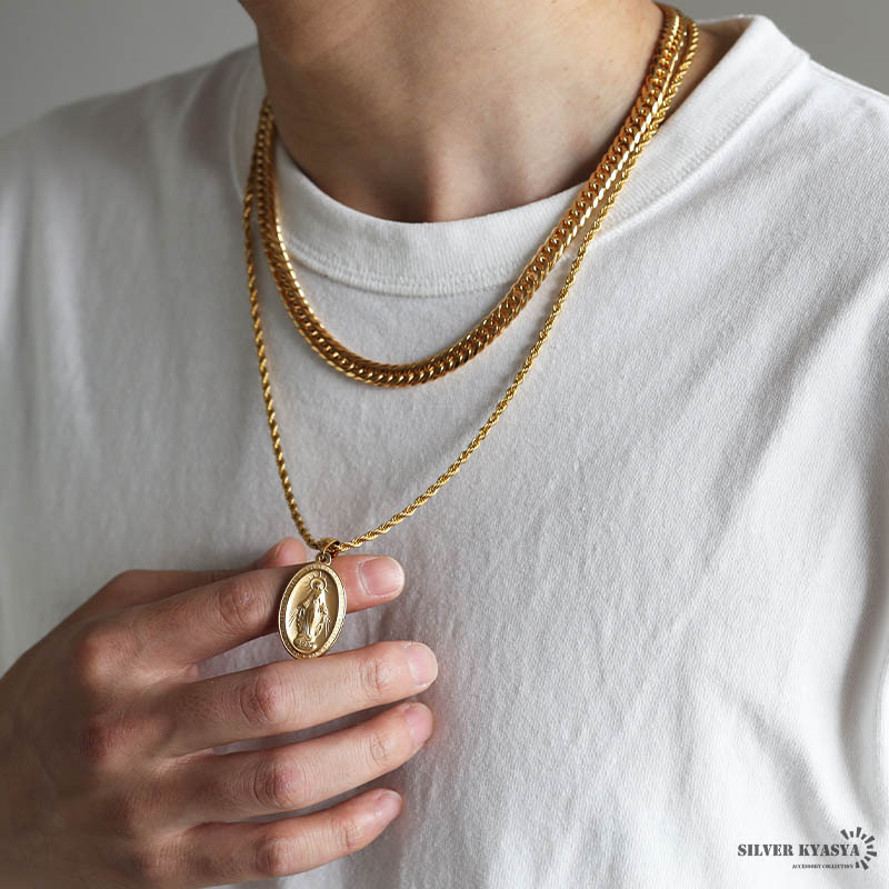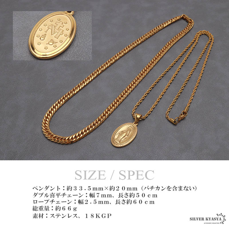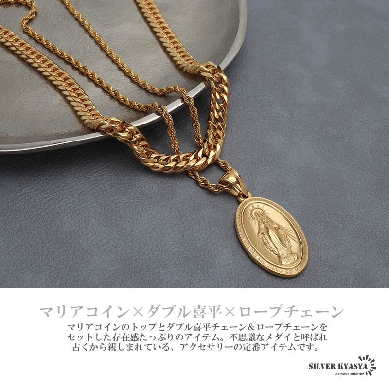 マリアコインのトップとダブル喜平チェーン&ロープチェーンをセットした存在感たっぷりのアイテム。不思議なメダイと呼ばれ古くから親しまれている、アクセサリーの定番アイテムです。