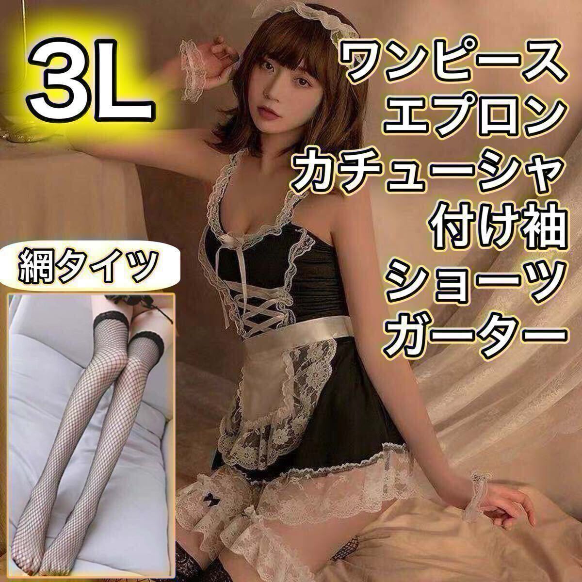 レディース ガーター エプロン カチューシャ 付け袖 大きいサイズ ブラック