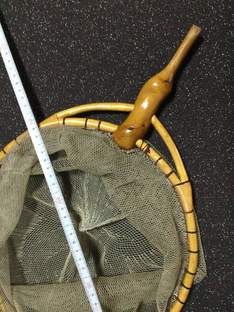【ヘら鮒釣り用】 手元の差し込み径は12ミリでございます。杜松をお洒落に拵えた凝った作りでむしゃんよかです。 お洒落な二重枠で本枠は12ミリ添え枠は9ミリの丈夫な作りの九寸の玉網です。網はやや使用感ありで一箇所ほつれがございますが使用に差し支えは無いていどです。網目は2、5ミリで小さなハリも浮く立派なものででございます。 枠は 肥後漆器の塗り師がいる当方専属の火の国夢工房にてリニューアル致しました中古美品です。