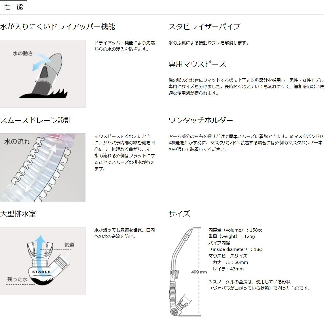 GULLのラインナップ中でも唯一排水室を備えたモデルで、万が一スノーケル内に水が入ってしまっても、