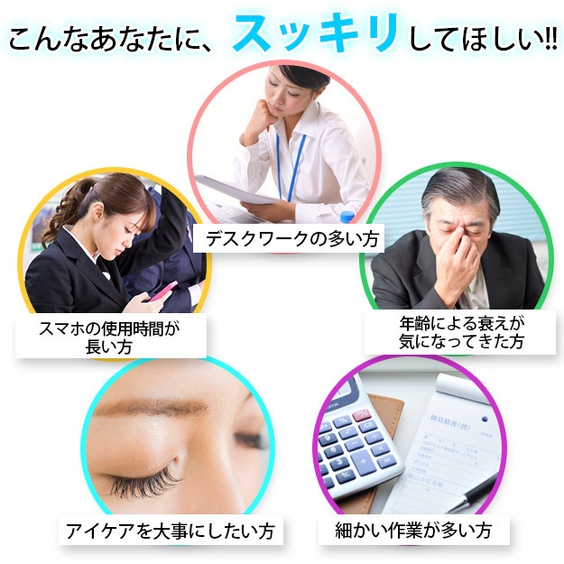 デスクワークの多い方、スマホの使用時間が長い方、アイケアを大事にしたい方、細かい作業が多い方、年齢による衰えが気になってきた方など。
