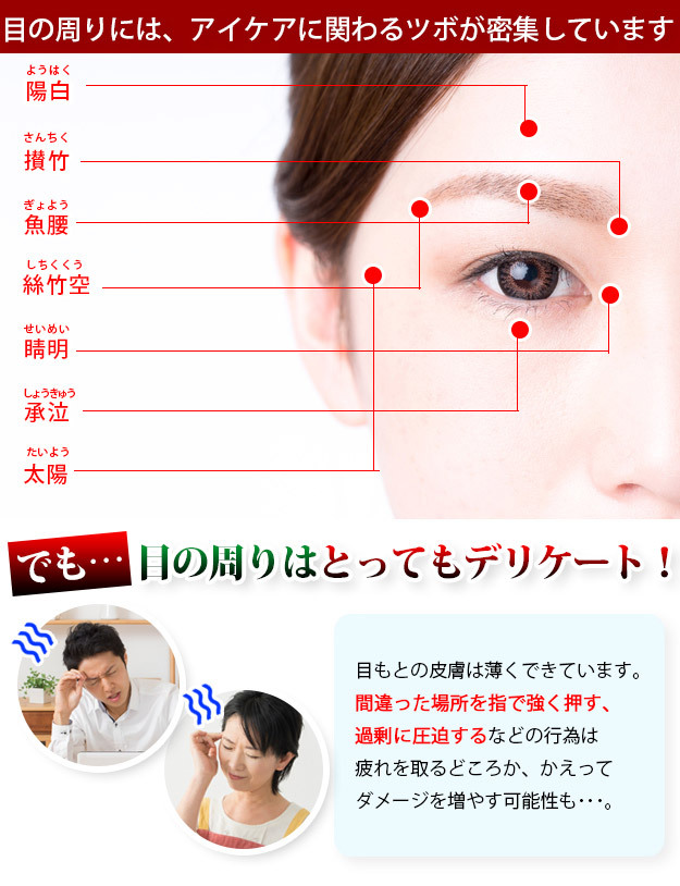 でも、目の周りはとってもデリケート!目もとの皮膚は薄く出来ています。間違った場所を指で押す、過剰に圧迫するなどの行為は疲れを取るどころか、かえってダメージを増やす可能性も・・・。