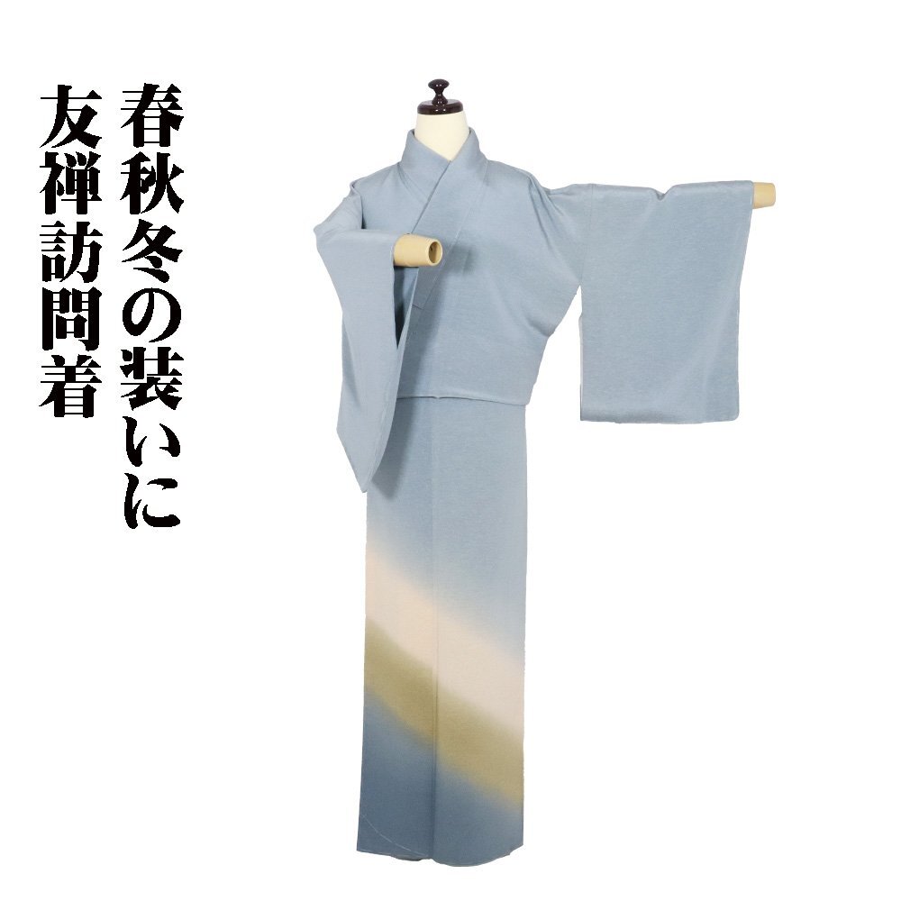 | 友禅訪問着 袷 丹後縮緬地 東雲地 薄緑(千草色)・ベージュ(蜂蜜色)抹茶色・小縞地 裾暈し 163 広襟 未使用品 仕付け付き |