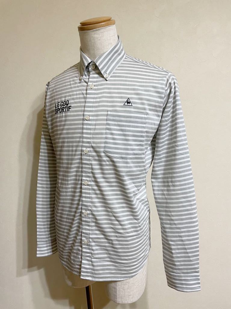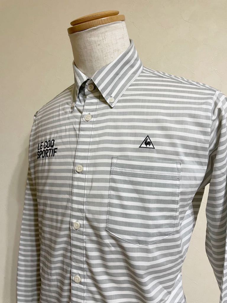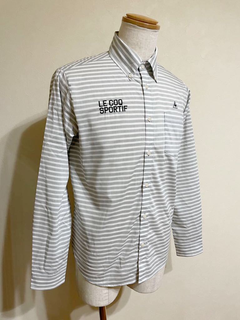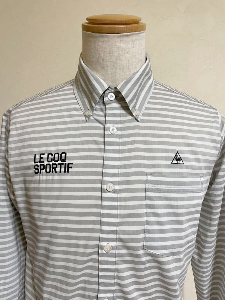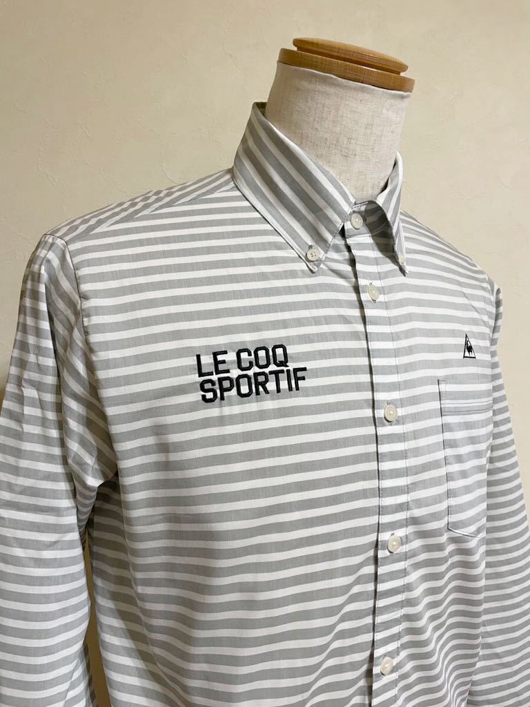 【良品】 le coq sportif golf ルコック ゴルフ ウェア ボーダー ボタンダウン シャツ トップス サイズL 長袖 グレー 白 QG1067 デサント