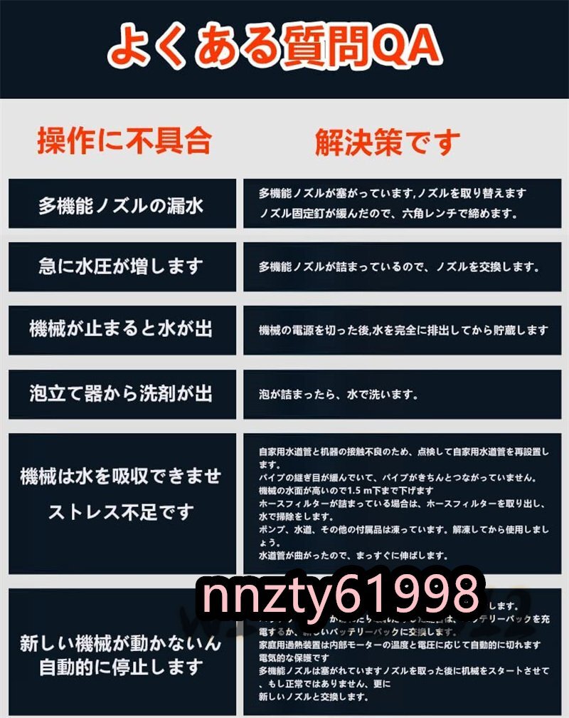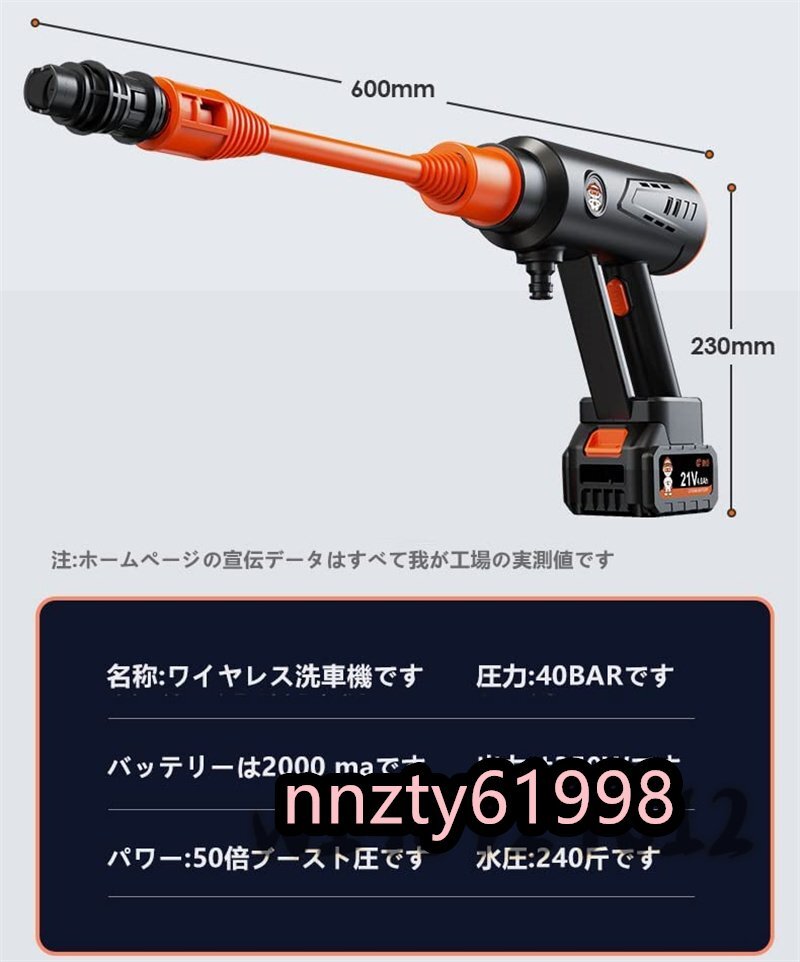 【多機能洗車ガンセット内容】本体、4.0Ah リチウム電池 、充電器、フィルター付き専用給水管(5m)、延長スプレーバー、方向調整ノズル、強化ストレートジェットノズル(ディフューザーノズル)、6速調整可能ノズル、フォームポット、ペットボトル用給水コネクター(内径26mm、外径33mm)、メッシュ収納袋。