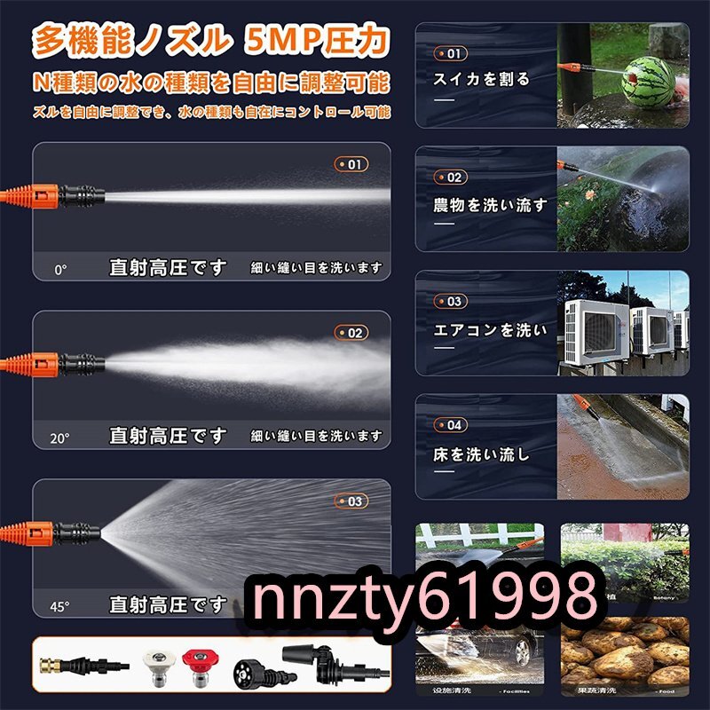 【高圧・低圧切替可能&ブラシレスモーター】3LCDディスプレイの水圧切り替えボタンを押すと、強ー赤い点灯、中ー黄い、弱ー青いの各モードを切り替えられる。高圧状態(4 .5Mpa)での使用時間は約20~30分、中圧状態(3.0Mpa)での使用時間は約30~40分、低圧状態(1.5Mpa)での使用時間は約40~50分です。吐出圧力:5MPa,吐出水量:6L/min,噴霧距離:6~10m。