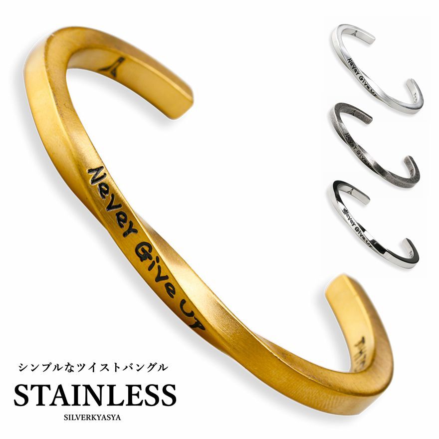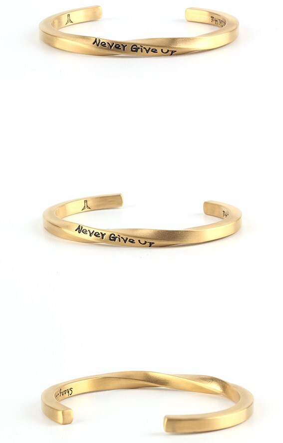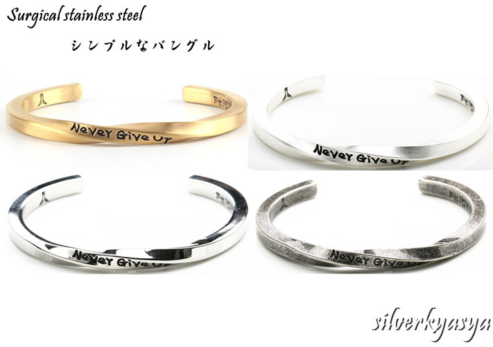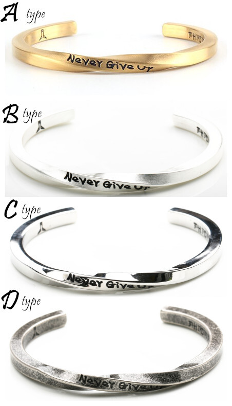 `nevergiveup`ネバーギブアップという文字を彫り込まれ、商品本体のように例え捻られても諦めないという頑丈な意志でいつでも励ましてくれます!