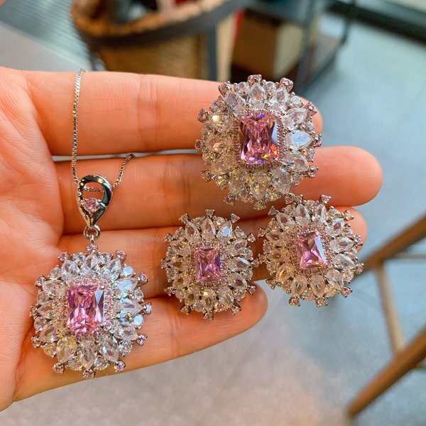 女性用ピンククォーツジュエリーセット(ネックレス、リング、ピアス)、パーティージュエリー、誕生日プレゼント