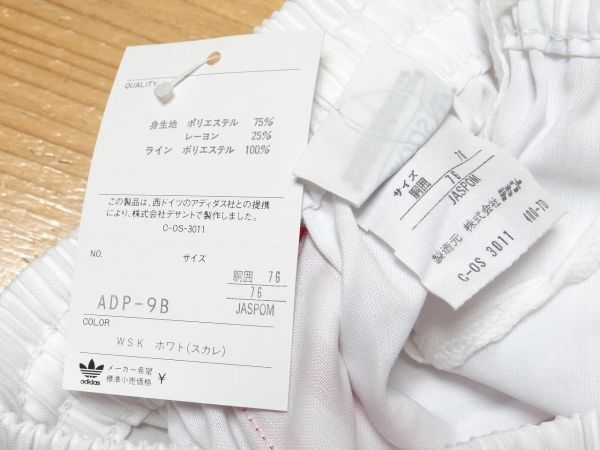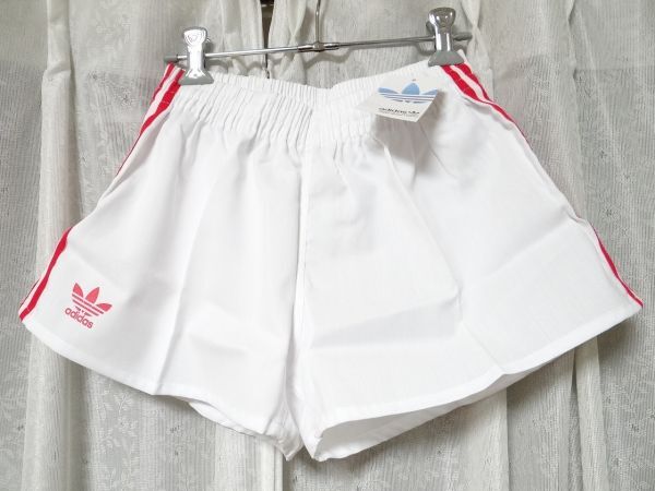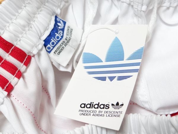 希少・ビンテージ!! 新品・デットストック(タグ付き)♪ 80年代頃のデサントの日本製、『 アディダス 』のショートパンツです。 ※写真の写り方によって、実際の色と違う場合がありますので、ご了承ください。 ■生地:ポリエステル75% レーヨン25%。 ■サイズ:M(胴囲76)。 新品になりますが、多少の汚れや擦れ傷など気になる、神経質の方は、ご遠慮下さいませ。 気に入った方、いかがでしょうか?