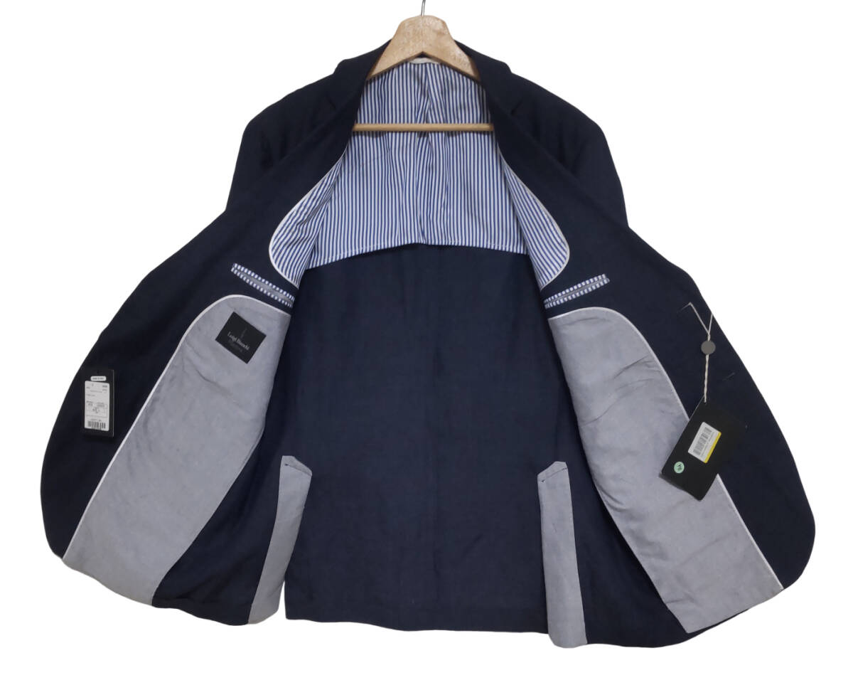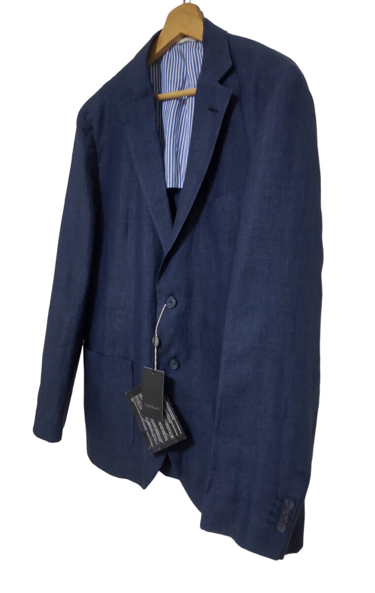 【イタリア製 LUIGI BIANCHI MANTOVA(ルイジ・ビアンキ・マントヴァ) ピュアリネンジャケット】 1911 年にイタリアのマントヴァで創業したスーツメーカー『Luigi Bianchi Mantova』はイタリアの名門Lubiam社が手掛けるファーストラインであり、イタリアでも最も古いファクトリーの1つです。創業以来、自社生産を行い伝統的且つ時代の最先端のスタイル、デザイン、最高の技術を武器にして、最高品質の様々な製品を世の中に送り出してきました。現代のライフスタイルにマッチした軽量で着心地の良い洗練されたデザインが魅力です。 ピュアリネンの特長は生地の手触り(質感)です。柔らかくさらりとした心地よい肌触りにソフトな風合い、独特のしなやかさと軽さもあり、非常に上質な質感の素材を使用したジャケットです。 サイズ:52 寸法(約/㎝):肩幅45 身幅52 袖丈64.5 身丈79 Made in Italy カラー:ネイビー | |