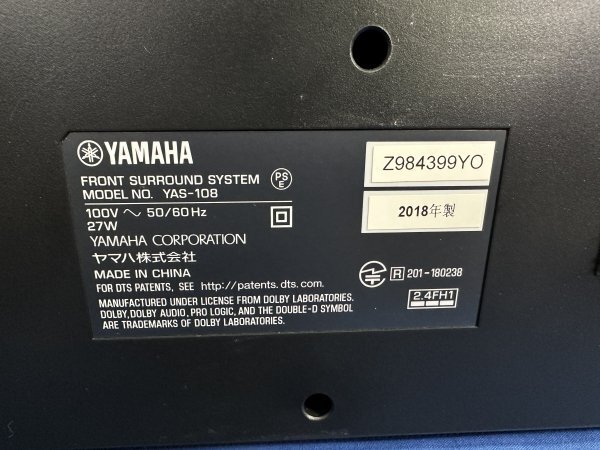 ヤマハ YAMAHA 2018年 YAS-108 サウンドバー フロントサラウンドシステム DTS Virtual:Xです。