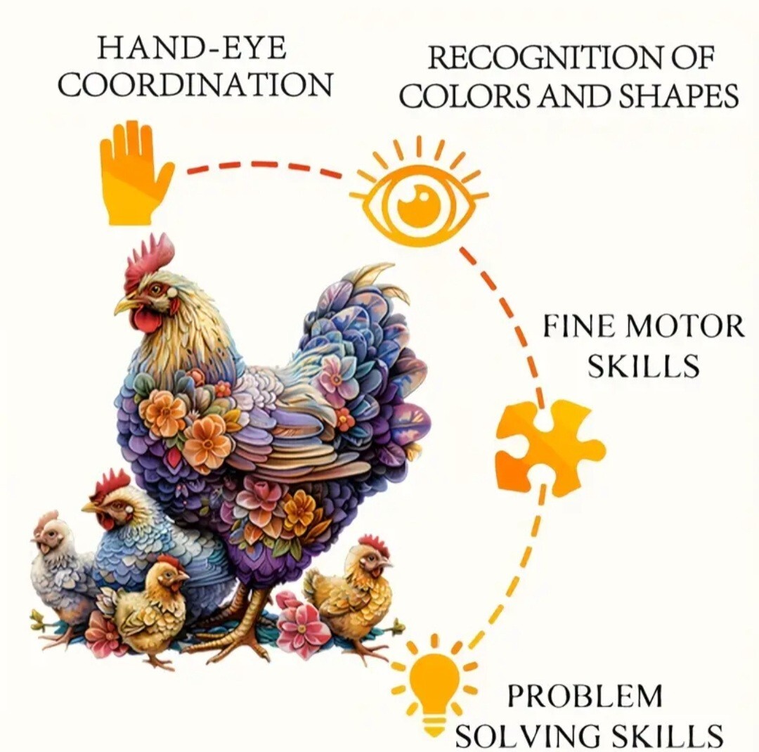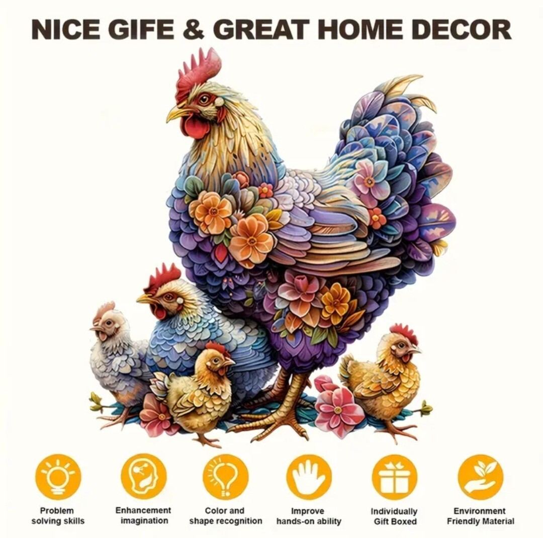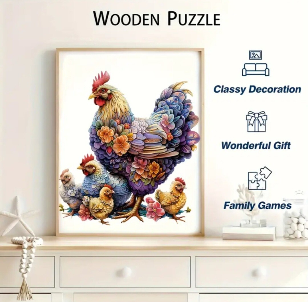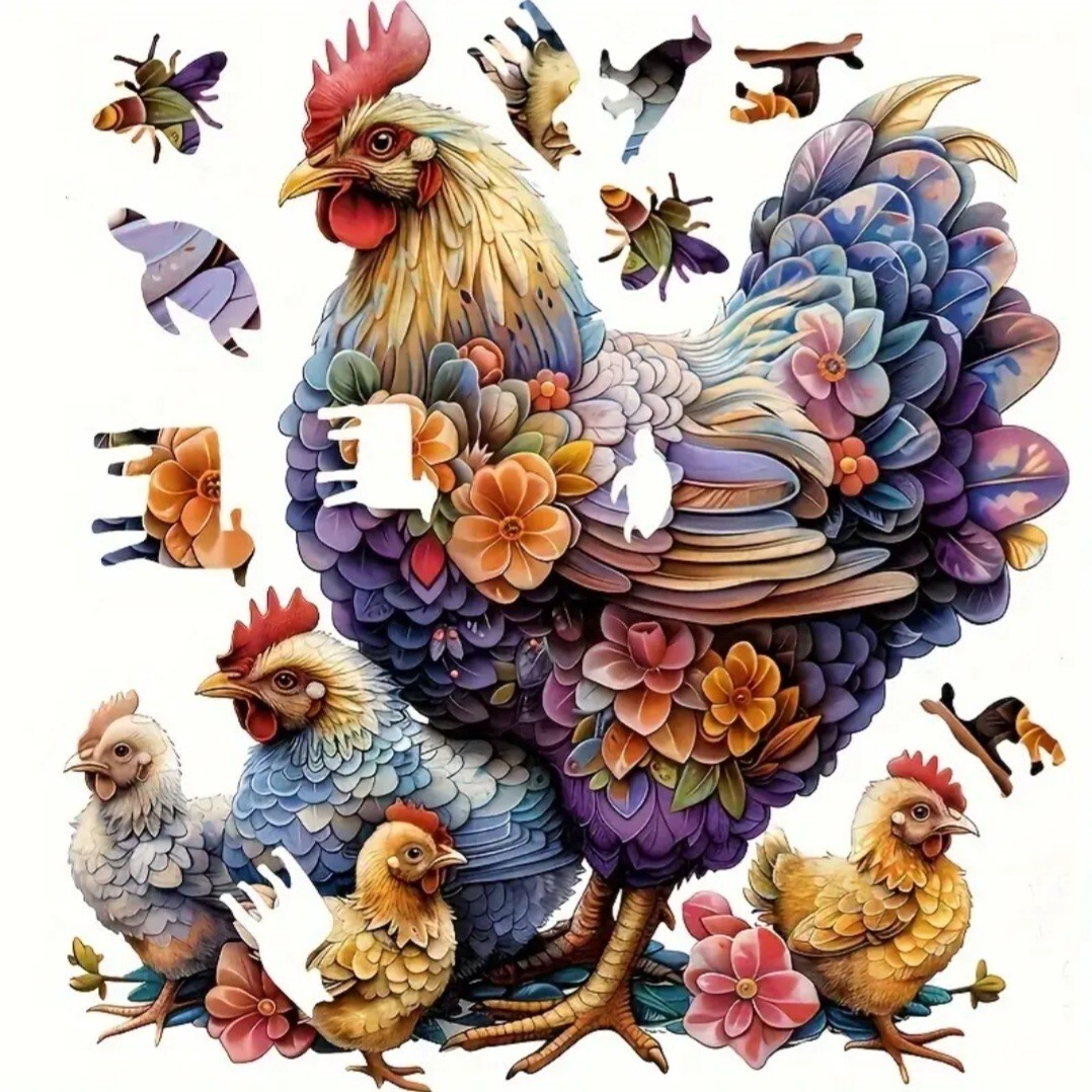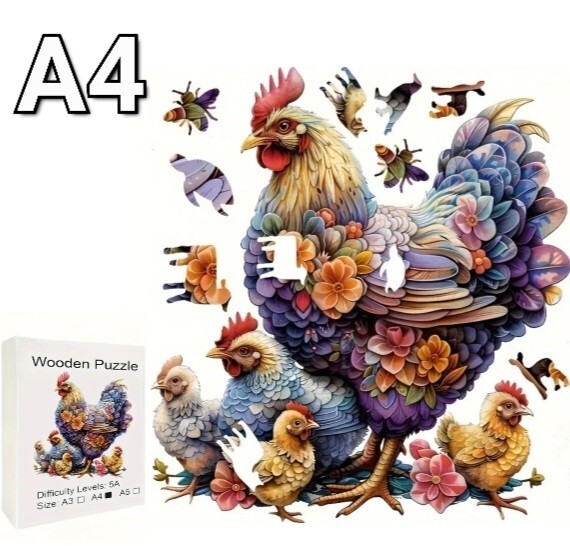 木製のジグソーパズルは、動物や植物のような形をした小さなピースでできています。