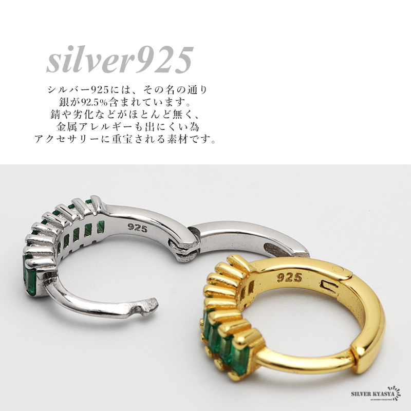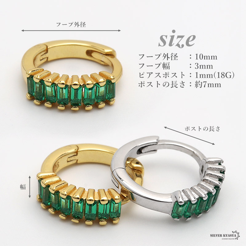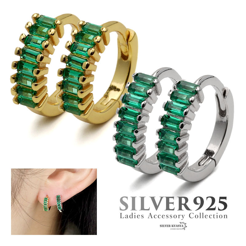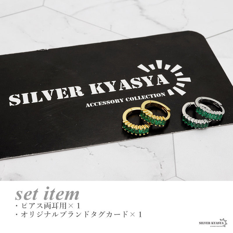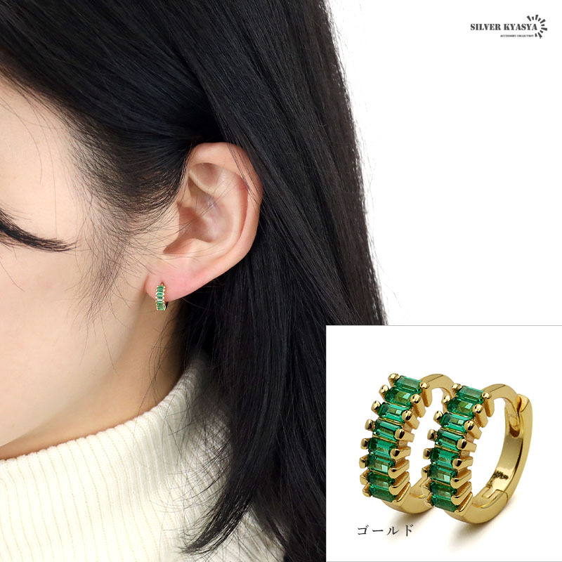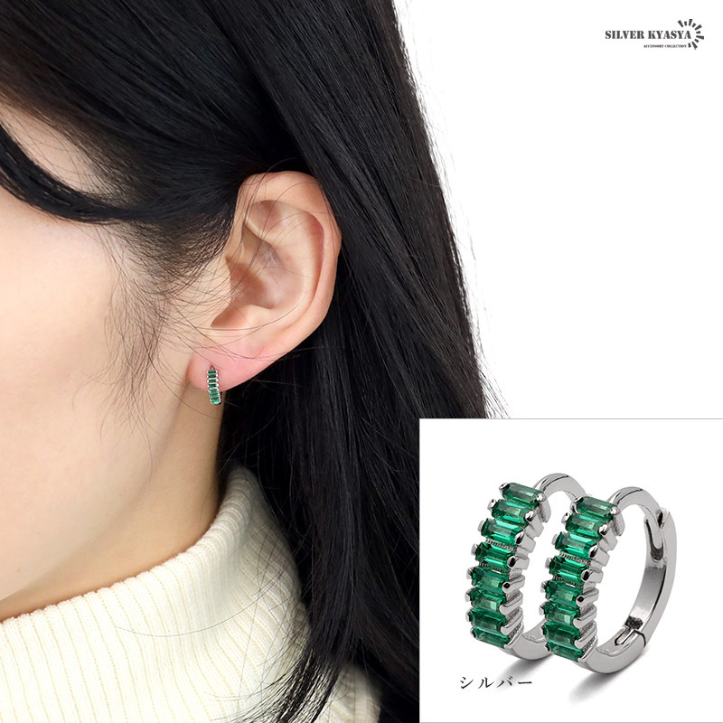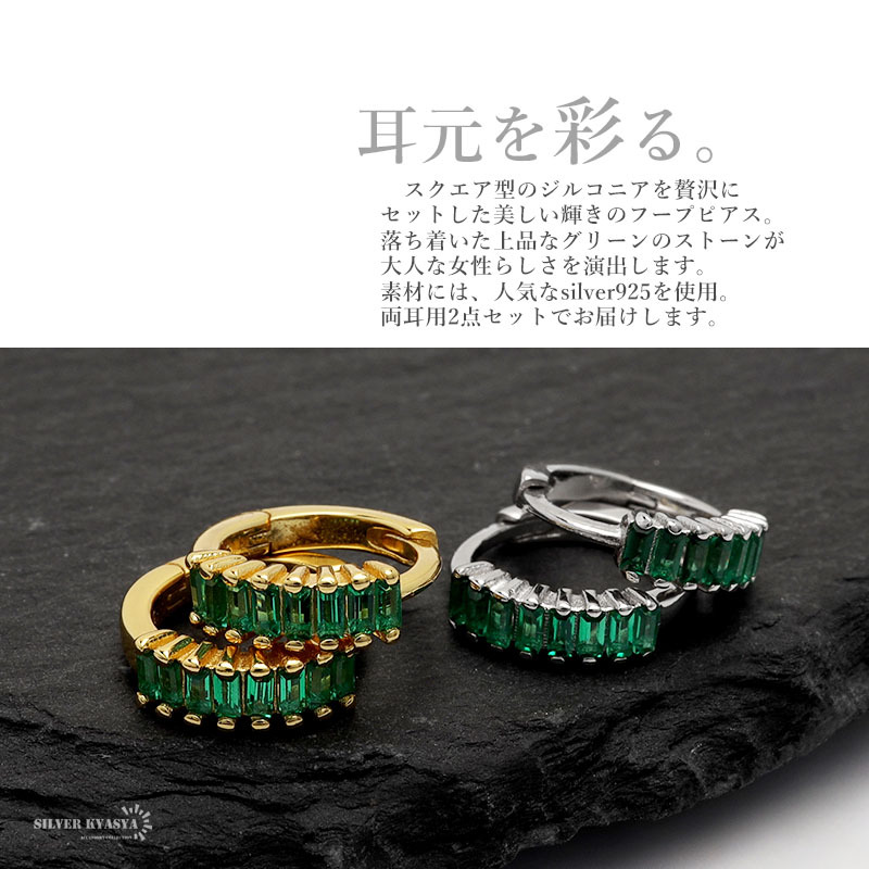 スクエア型のジルコニアを贅沢にセットした美しい輝きのフープピアス。落ち着いた上品なグリーンのストーンが大人な女性らしさを演出します。