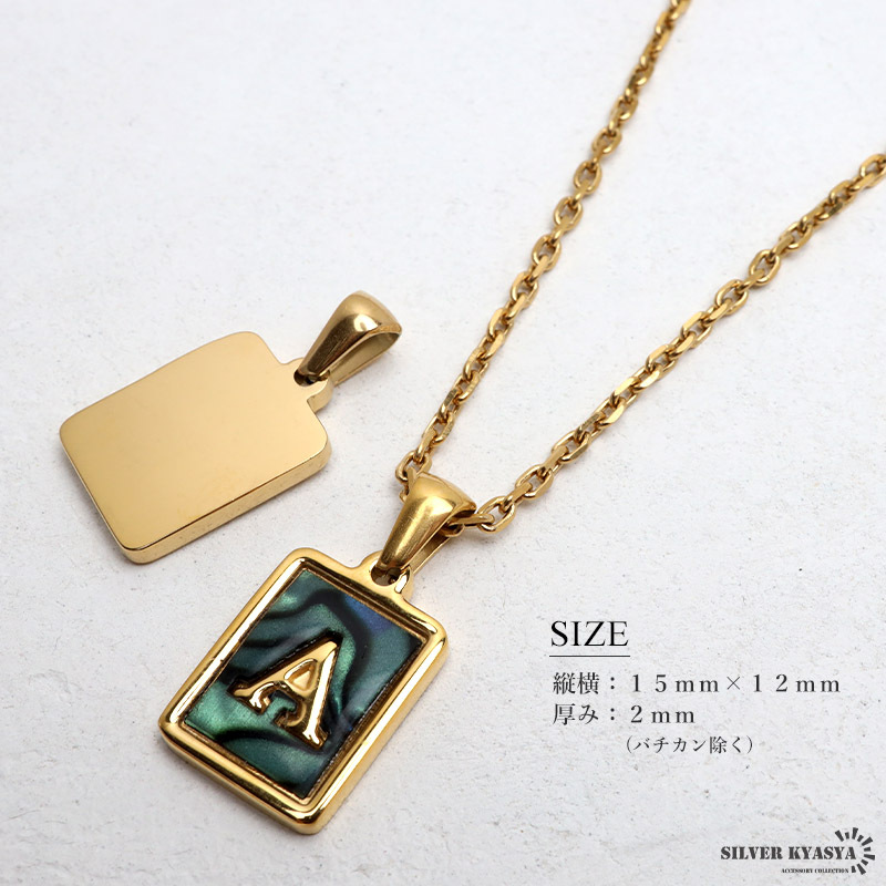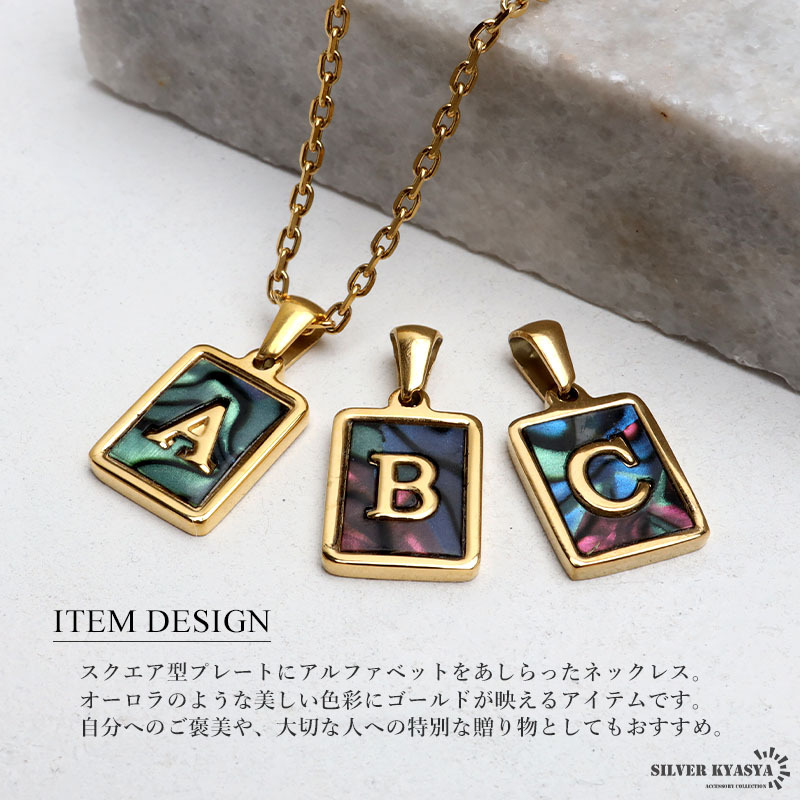 スクエア型プレートにアルファベットをあしらったネックレス。オーロラのような美しい色彩にゴールドが映えるアイテムです。自分へのご褒美や、大切な人への贈り物としてもおすすめ。