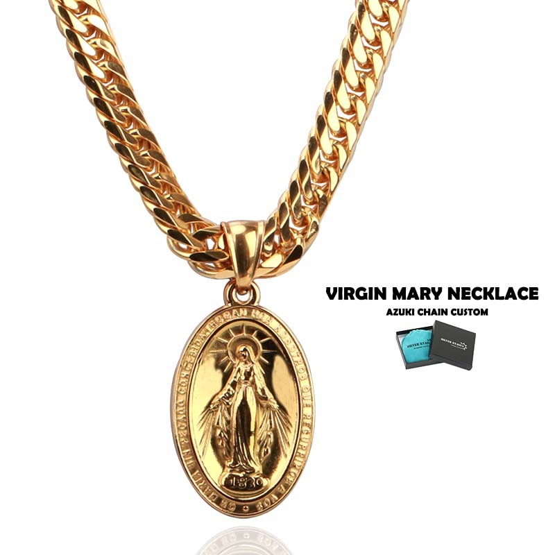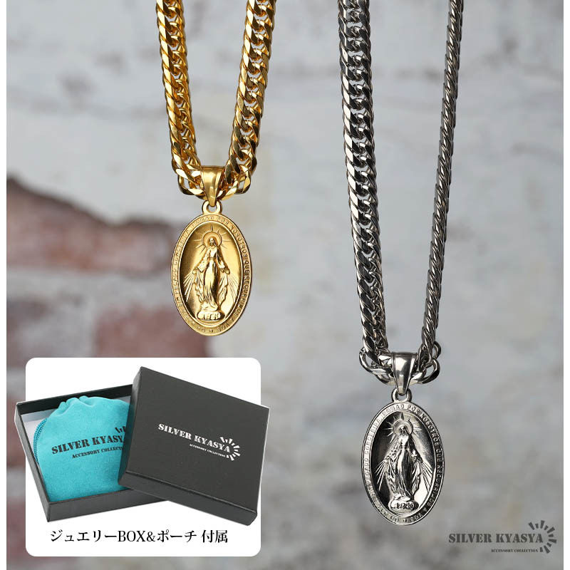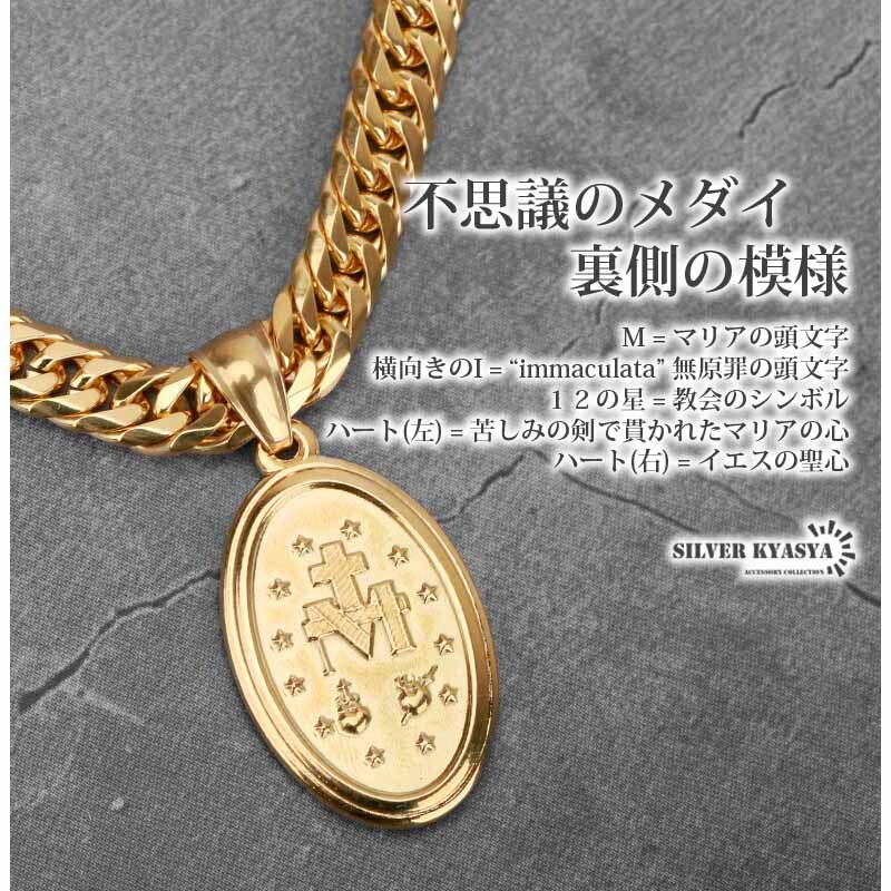 マリアコインのトップとダブル喜平チェーンをセットした存在感たっぷりのアイテム。不思議なメダイと呼ばれ古くから親しまれている、アクセサリーの定番アイテムです。