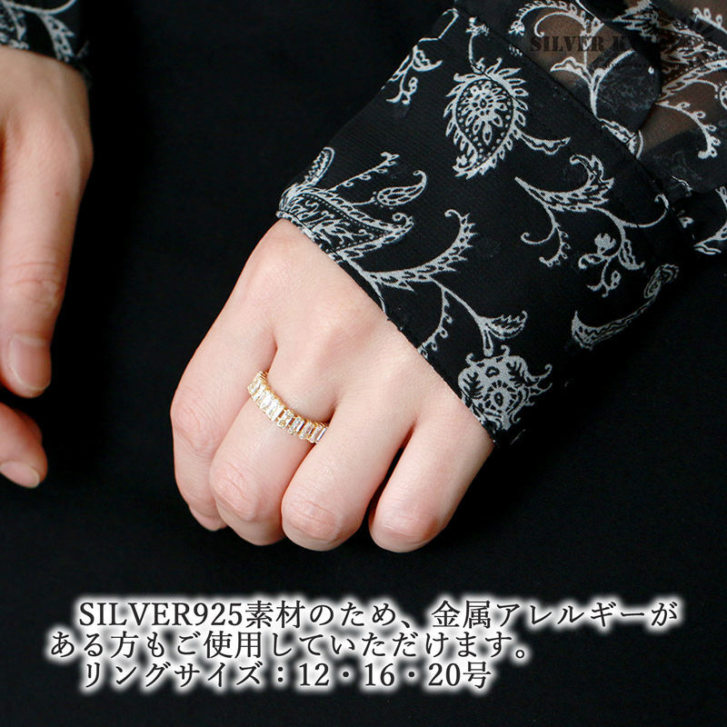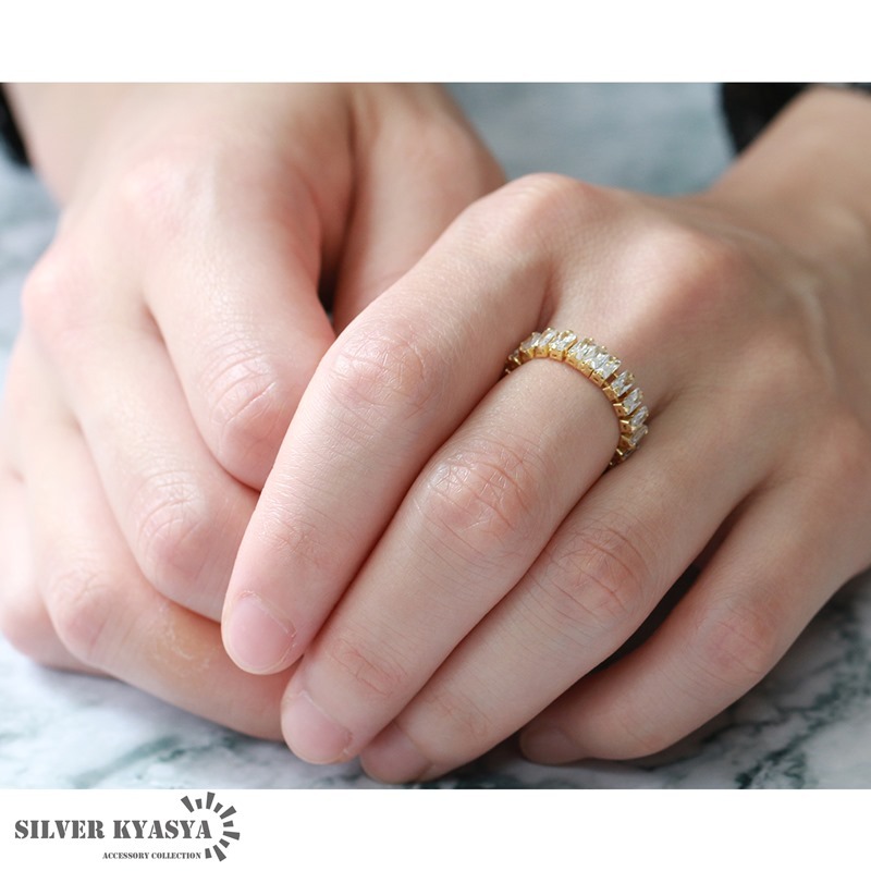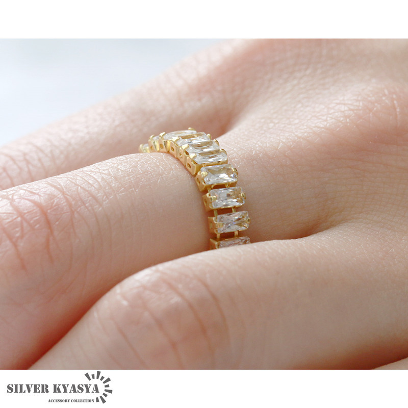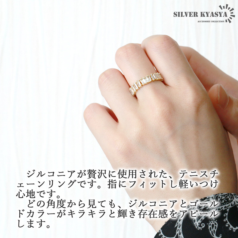 魅力的なスクエアカットのジルコニアが贅沢に使用されたテニスチェーンリングです!指にフィットし華やかな指元を演出します!様々な角度からの光を反射し、動作があるたびにキラリと輝くアイテムです!アクセントに最適で存在感も申し分なしです!