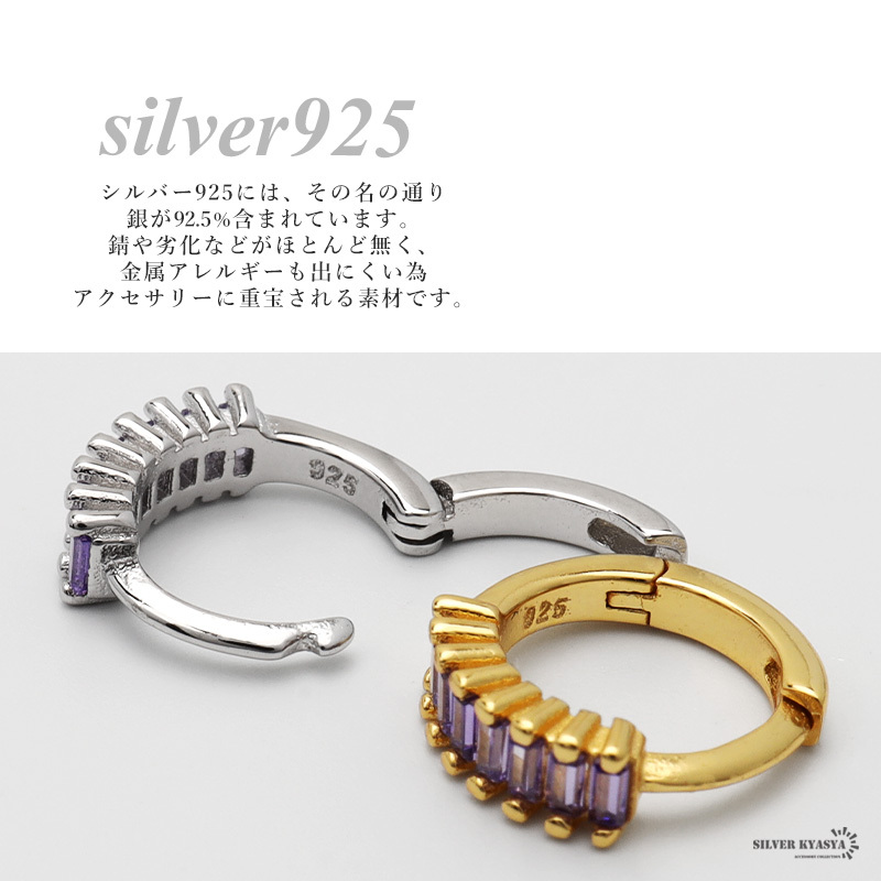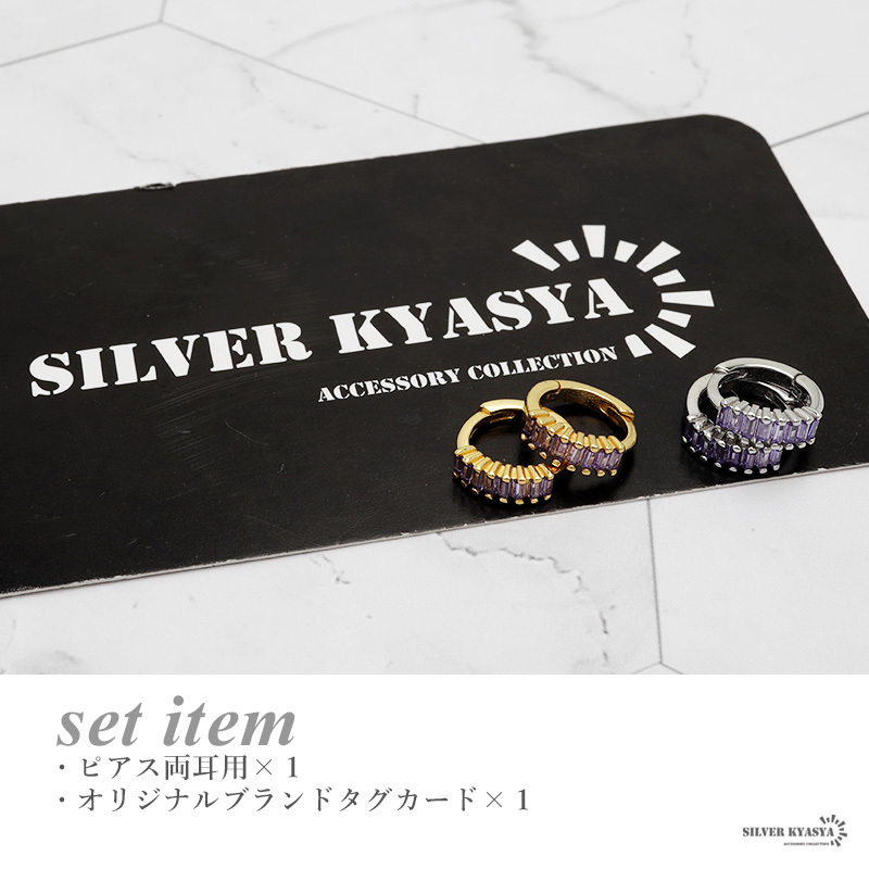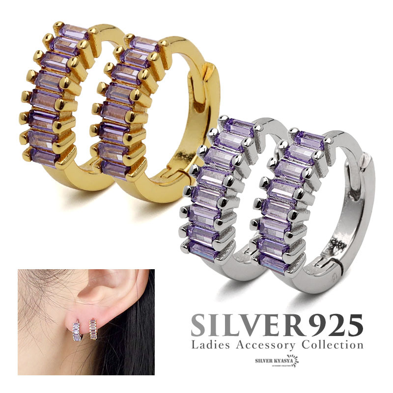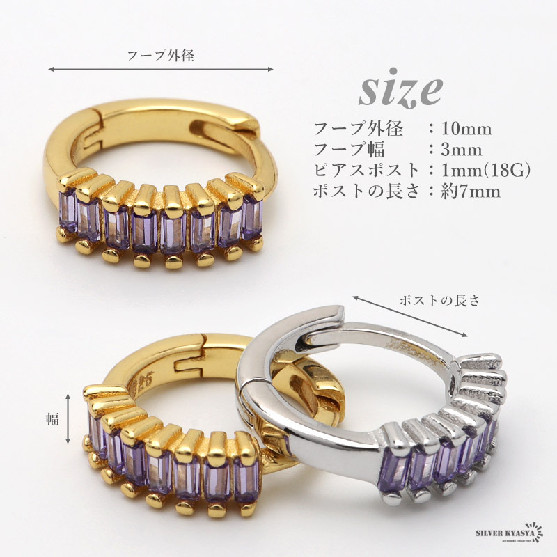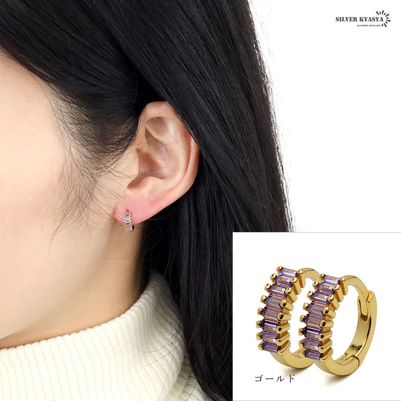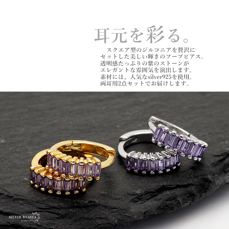 スクエア型のジルコニアを贅沢にセットした美しい輝きのフープピアス。透明感たっぷりの紫のストーンがエレガントな雰囲気を演出します。