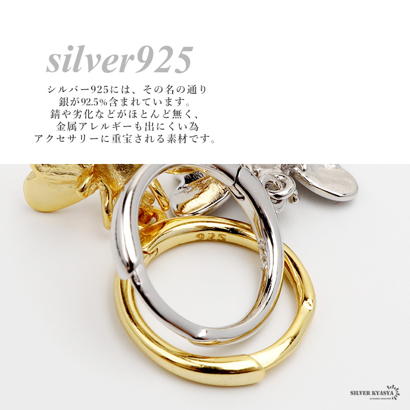 シルバー925は、銀含有率(純度)92.5%を示し、一般的に純銀として扱われています。サビや劣化等がほとんどなく金属アレルギーも出にくいとされており、アクセサリーとして重宝される金属です。