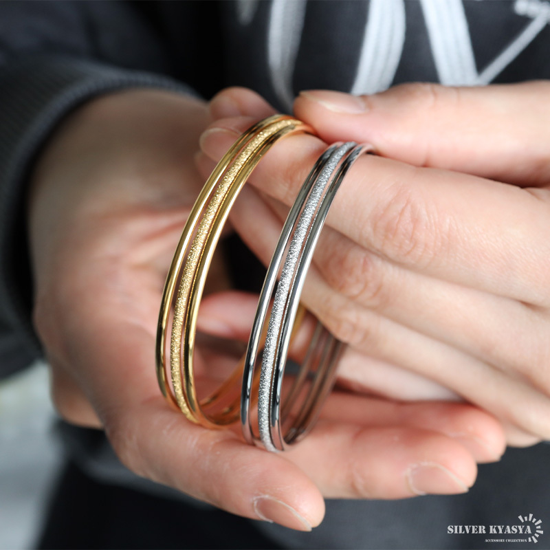 細身でシンプルな3点セットバングル。異なるデザインを採用しメリハリのある印象に。単体でも、重ね付けにもおすすめのアイテムです。