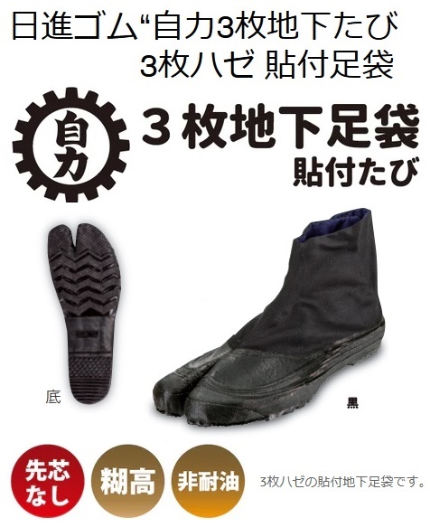 日進ゴムNISSHIN RUBBER日進ゴムの地下足袋「自力」シリーズ自力3枚地下たび ブラック品番:C-3枚Fサイズ:25.5cm■特長・3枚ハゼの貼付地下足袋です・先芯なし・糊高・非耐油